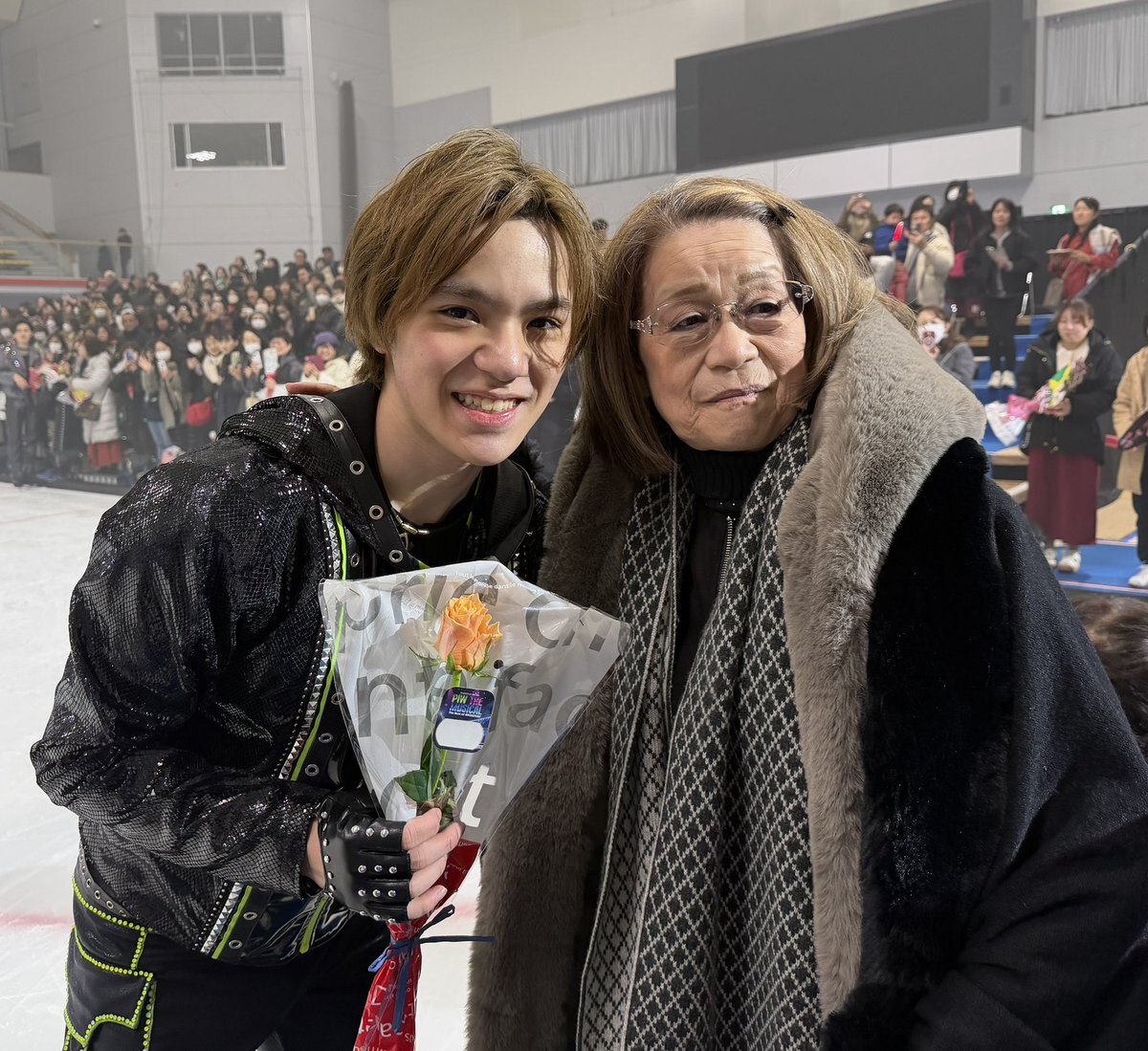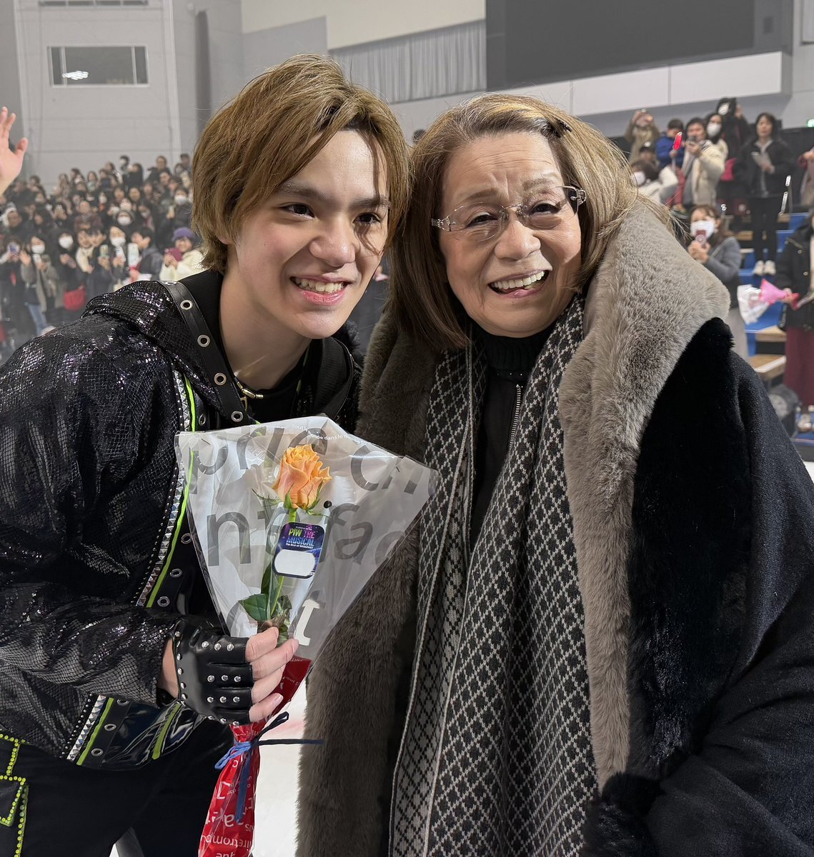 昌磨はまぁだ?と何回もお聞きになるので、先生、彼は人気者なので少々お待ちくださいませとお話ししていたら、来てくれました。 ちょっと待ちくたびれられたかもしれません🤣 このお花は先生から🧡 #山田満知子 先生 #宇野昌磨 #PIW2025愛知