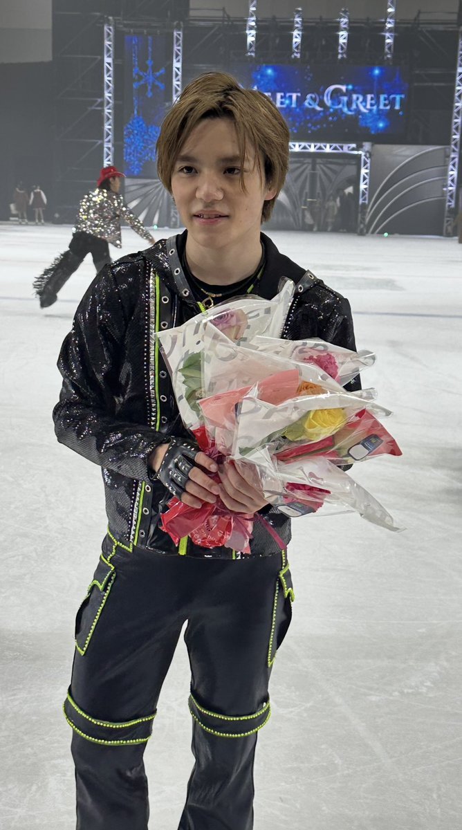 返信先:@tontonsasa2こんにちは!お近くの席にいらっしゃったんですね、お渡ししている最中の写真はなかなか自分では撮れないのでありがたいです☺️💐 昨日は良い笑顔の昌磨くんが見られて嬉しかったですね😊リプありがとうございました!