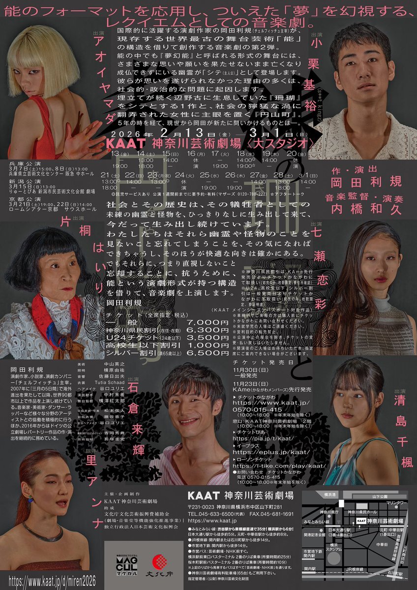 【公演詳細決定&ビジュアル解禁!】 能のフォーマットを応用し、ついえた「夢」を幻視する、レクイエムとしての音楽劇 『#未練の幽霊と怪物―「珊瑚」「円山町」―』 📅2026/2/13(金)~3/1(日)<大スタジオ> 🎟️KAme先行:11/23(日・祝) / 一般:11/30(日) 🔗kaat.jp/d/miren2026 作・演出
