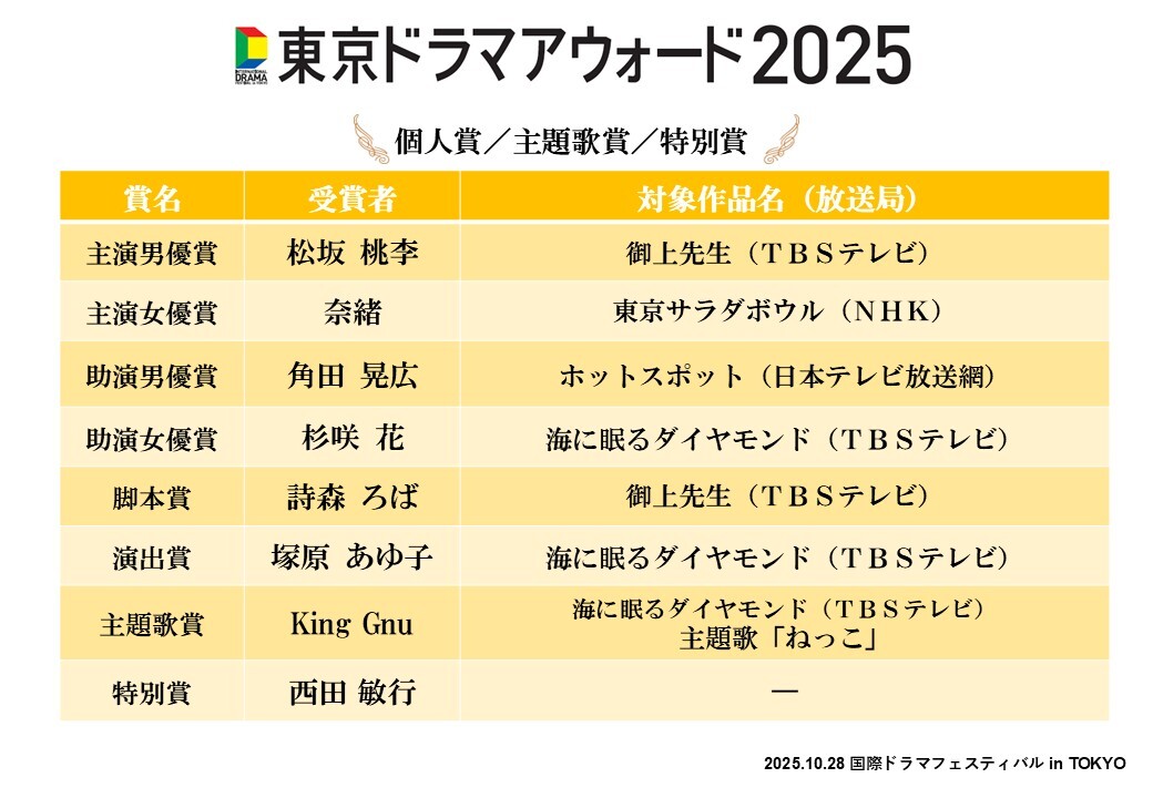 【公式】#東京ドラマアウォード2025 個人賞は #松坂桃李 さん #奈緒 さん #角田晃広 さん #杉咲花さん #詩森ろば さん #塚原あゆ子 さん 主題歌賞は #KingGnu さん が受賞です! ▼受賞作品紹介ページはこちら j-ba.or.jp/drafes/award/