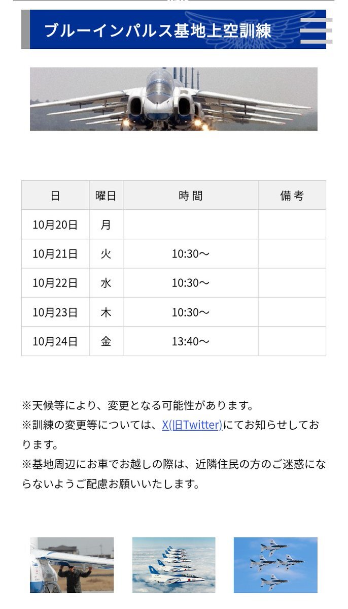 おはようございます😊 来週のフィールドアクロ予定が出ましたね😁週末には浜松基地航空祭が控えているので火曜からみっちりアクロが入っていましたね😀 BlueImpulseTOUR2025も後半戦に入ってきています🤗残りの展示飛行も無事に飛べること良いですね✈️𓈒𓂂𓏸 #松島基地 #ブルーインパルス pic.x.com/m6EekCj286