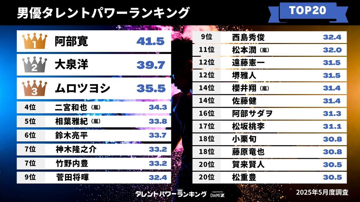 タレントパワーランキング 2025年5月度・最新男優タレントパワーランキングTOP20 tpranking.com/actor-202505?p… ◆ 男優タレントパワーランキング 4位「二宮和也」34.3 5位「相葉雅紀」33.8 11位「松本潤」32.0 14位「櫻井翔」31.4 *10~60代男女の回答結果 # #櫻井翔 #相葉雅紀 #二宮和也 #松本潤 pic.x.com/NXF8ivCCya