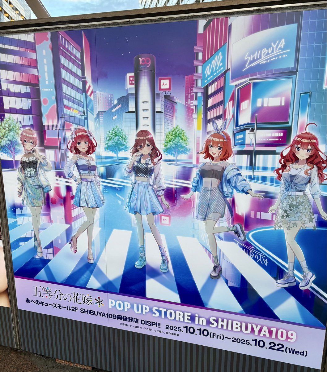 渋谷109で開催中の五等分の花嫁POP UP SHOPに行っていました! なかなか男1人で109は入りづらかった😅 クリアファイルを買おうかなと思ったら一花が売切で断念… 昨今の一花人気は何なんのだろうか? それはそれとして今回ビジュが良すぎる🥰 #五等分の花嫁 #五等分109 pic.x.com/43e80Q8x9R