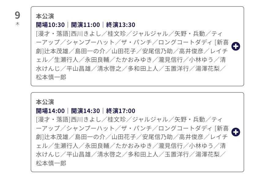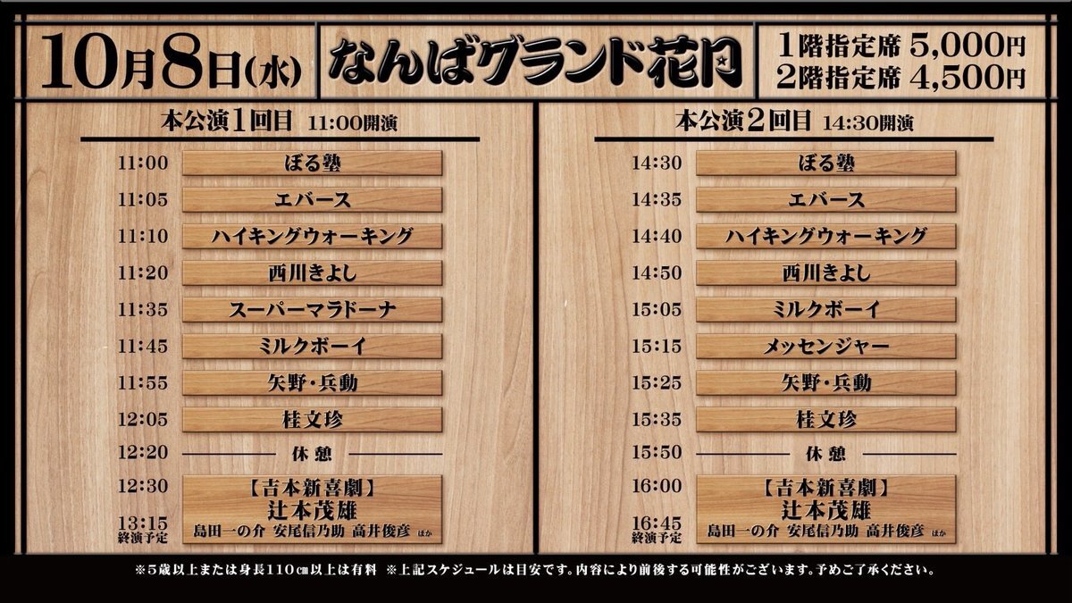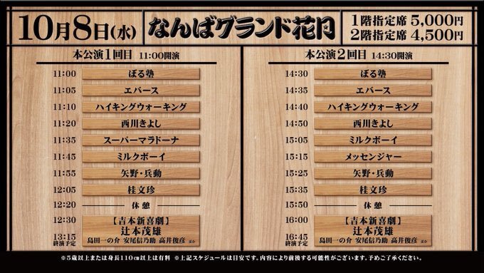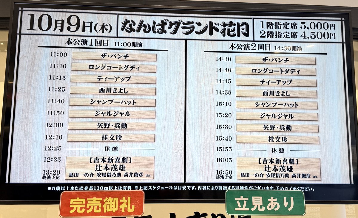 ⚪️本日:配信なし 10/9(木)開場10:30/開演11:00「本公演 1回目」 10/9(木)開場14:00/開演14:30「本公演 2回目」 西川きよし 桂文珍 ジャルジャル 矢野・兵動 ティーアップ シャンプーハット ザ・パンチ ロングコートダディ [新喜劇メンバー] @ なんばグランド花月 pic.x.com/YSHKbeTpCZ