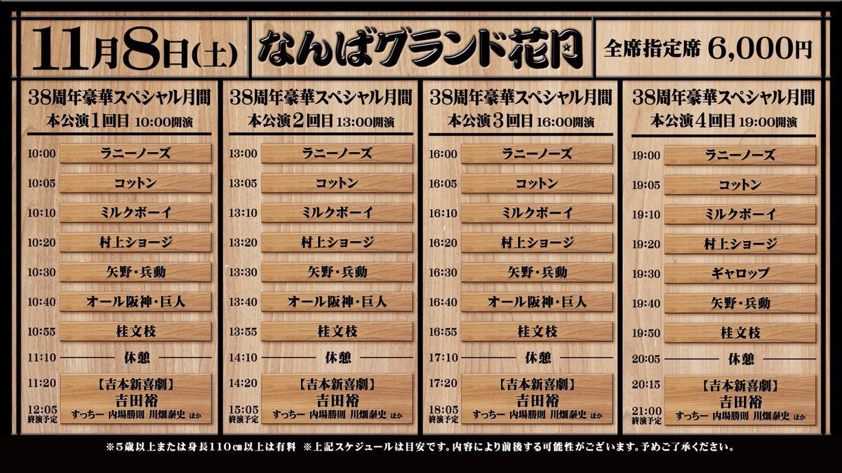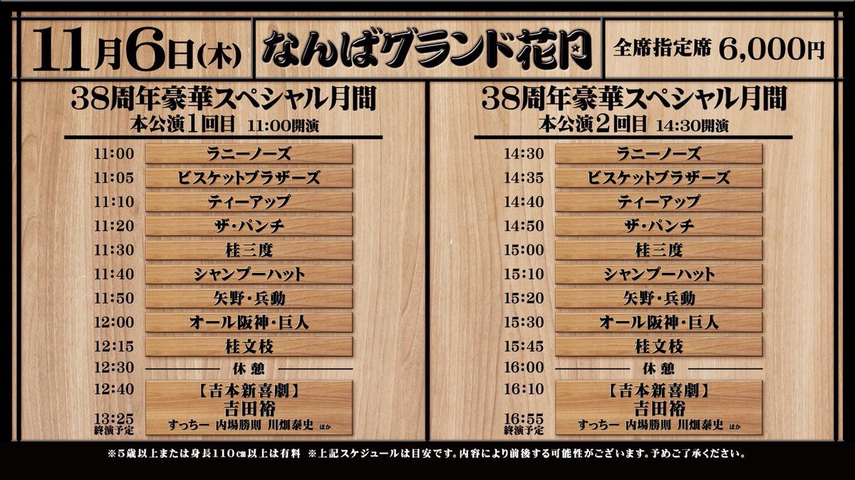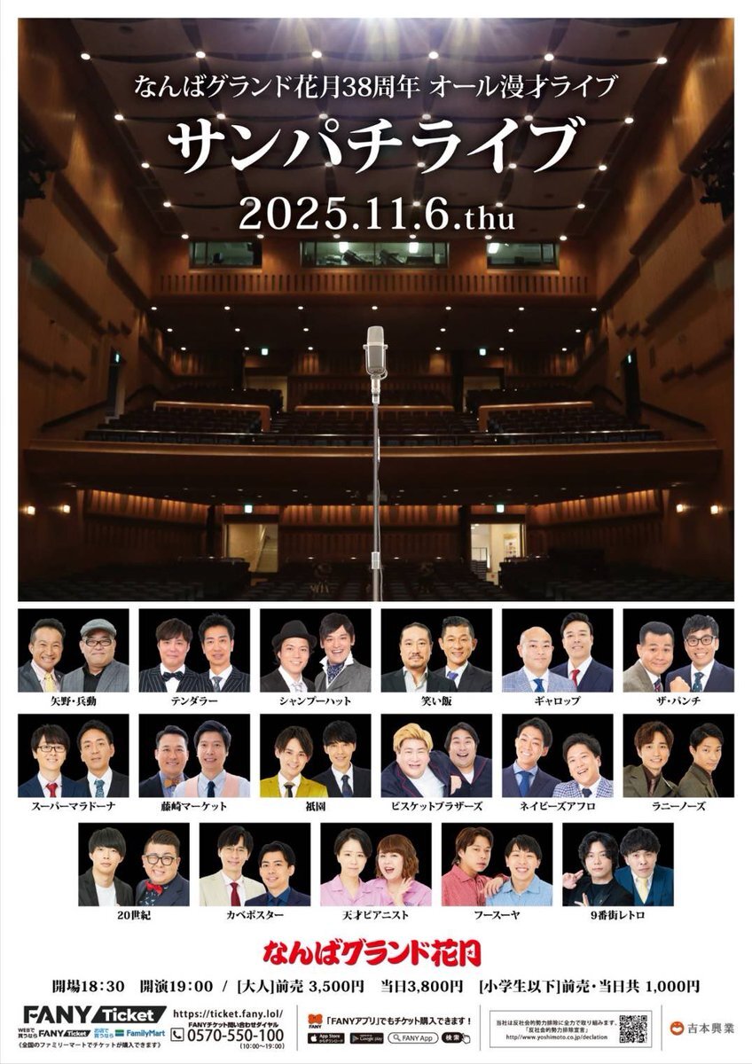 【今日2】 なんばグランド花月38周年 『サンパチライブ』 11月6日(木)開場18:30 開演19:00 なんばグランド花月 前売大人3500円 当日大人3800円 小学生以下1000円 出演:矢野・兵動/テンダラー/シャンプーハット/笑い飯/ギャロップ/スーパーマラドーナ/藤崎マーケット/祇園/ネイビーズアフロ/他 pic.x.com/lFcW3Y2KIa