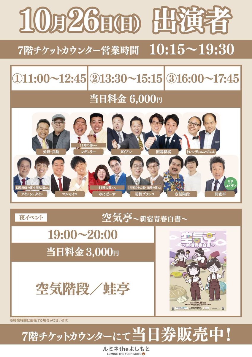 【当日券販売中🎫】 『空気階段』が出演! 13時30分の部、ただ今開演中✨️ 本日は、 他にも『矢野・兵動』『ダイアン』 『アインシュタイン』『空気階段』などのネタや 『間寛平』率いるSPコメディも楽しめます🙌 また、『空気階段』は本日の夜イベント 【空気亭】にも出演! 当日券販売中です🎟 pic.x.com/Jk04KVFwGc