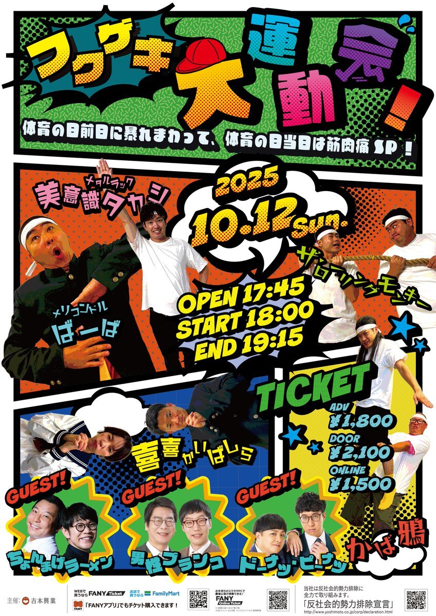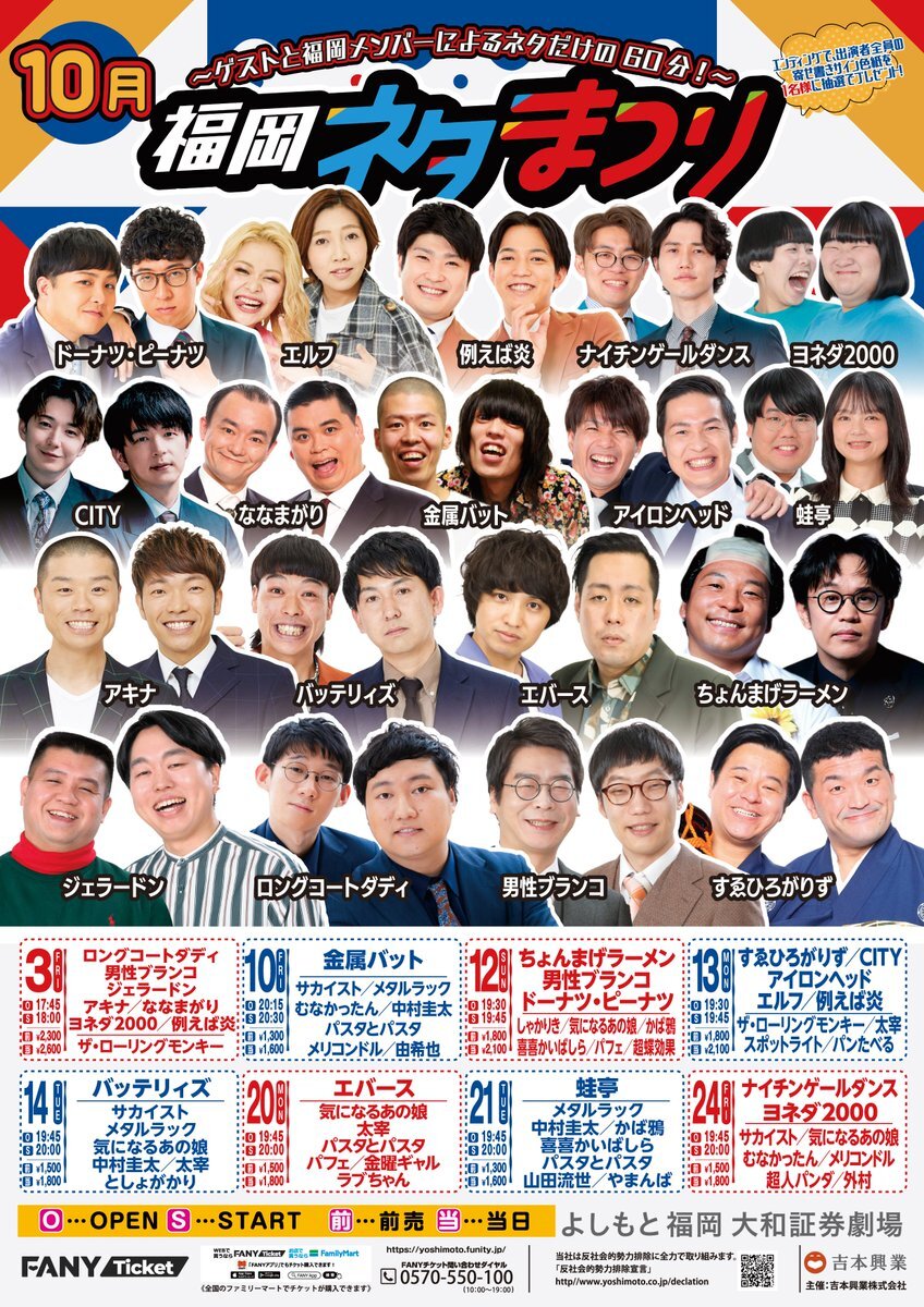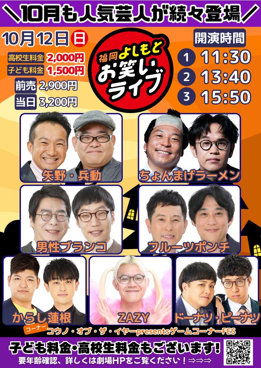 ⭐️10/12(日)『福岡よしもとお笑いライブ』⭐️ 豪華出演者が続々登場🌈 笑いっぱなしの90分😆💕 子ども料金・高校生料金もございます✨ ❤️10月12日(日) 『福岡よしもとお笑いライブ』 ①11:30開演 ②13:40開演 ③15:50開演 矢野・兵動/ちょんまげラーメン 男性ブランコ/フルーツポンチ pic.x.com/E9HXVzCuo0