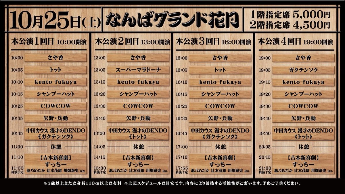 本日10月25日(土)の予定① ①10:00~③16:00~④19:00~ 本公演 会場:なんばグランド花月 当日:一階指定席¥5,000/二階指定席¥4,500 [漫才・落語]中田カウス 漫才のDENDO/矢野・兵動/COWCOW/シャンプーハット/ガクテンソク/トット/kento fukaya/さや香
