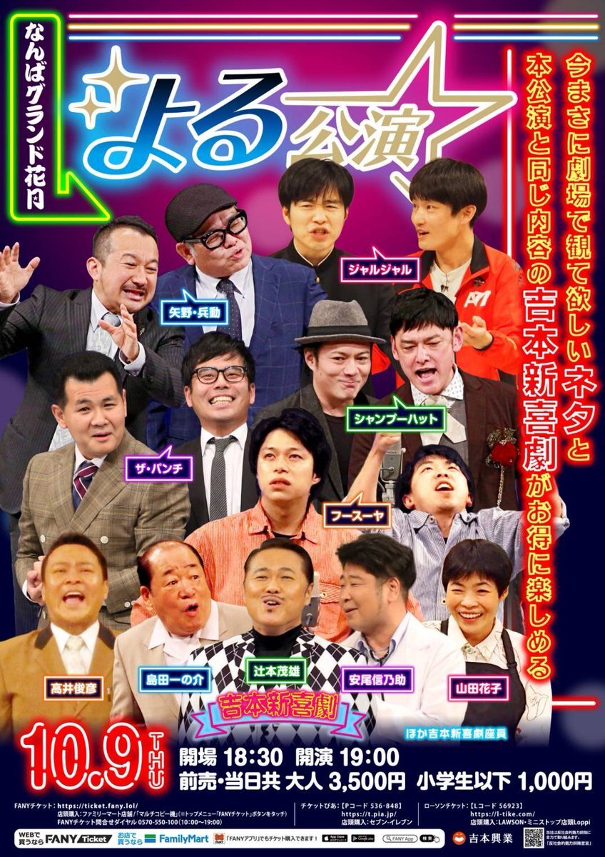 今月のLINEクーポンは下記の公演が対象になっています⬇️ 【舞台】よる公演 2025年10月22日(水)19:00〜21:00 なんばグランド花月 🎫前売3,500円 [漫才・落語]笑い飯/矢野・兵動/ザ・プラン9/タナからイケダ/ミキ/翠星チークダンス x.com/namba_g_kagets…
