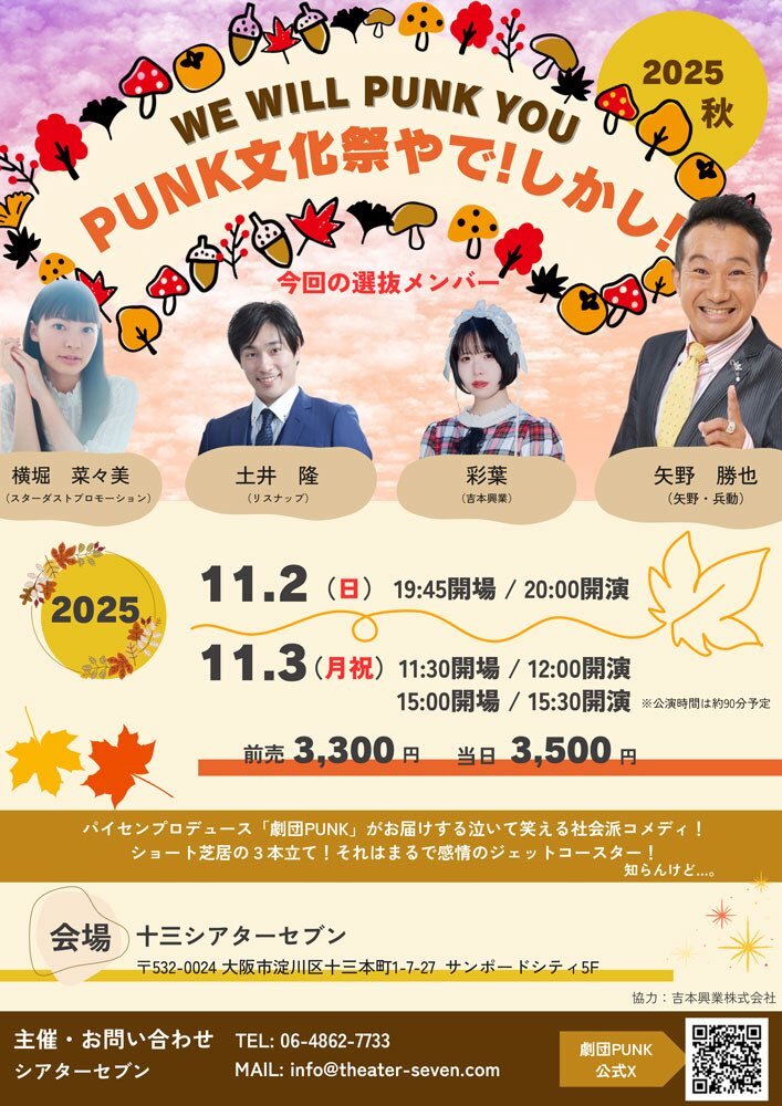 【開催迫る!!】 WE WILL PUNK YOU 2025秋 〜PUNK文化祭やで!しかし!!〜 theater-seven.com/ev/ev_s251102.… 11/2と11/3の2日間で3公演! 今回もショート芝居3本立て! “御堂筋ランウェイ”もいいけど、“十三パイセン”もね!! 出演:#劇団PUNK 選抜メンバー #矢野勝也(#矢野・兵動)#横堀菜々美 #土井隆 #彩葉 pic.x.com/x2Ok5GZwbj