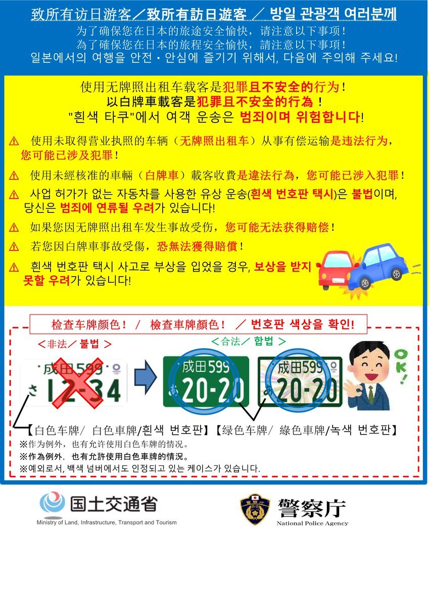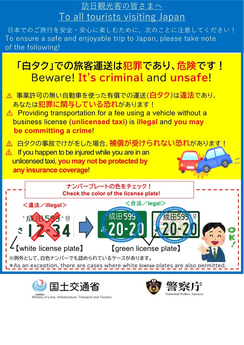【白タク利用禁止 啓発活動】 10月3日 石川運輸支局は、警察や石川県タクシー協会と連携して外国人観光客が到着する小松空港で外国人観光客に白タクの違法性と危険性への注意を呼び掛ける啓発活動を実施しました。 今後も違法な白タク行為の排除に向けて取り組んでいきます。 #白タク #石川運輸支局 pic.x.com/KIN3NU0x18