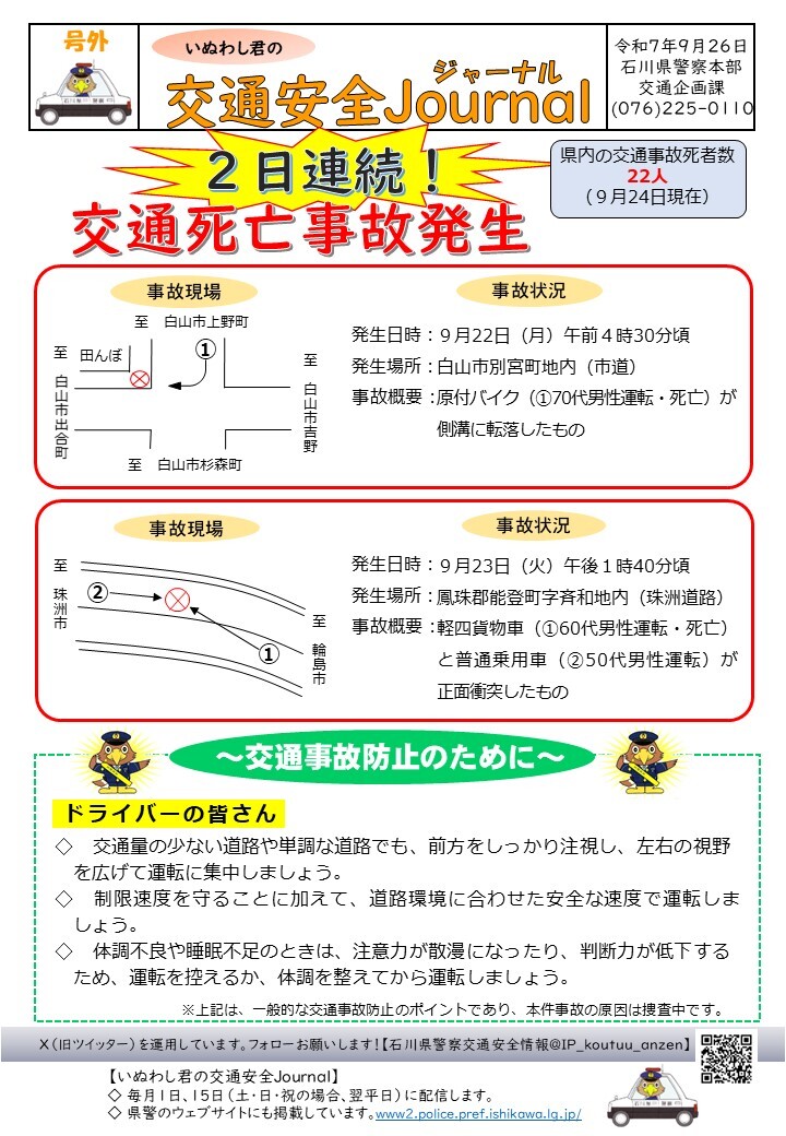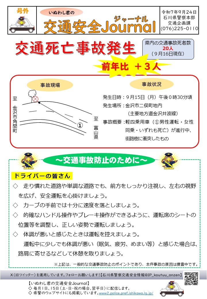 【交通安全情報】 9月16日付け「いぬわし君の交通安全Journal」を掲載します。 バックナンバーは、石川県警察ウェブサイト(www2.police.pref.ishikawa.lg.jp/trafficsafety/…)に掲載していますので、こちらもご覧ください。 #石川県警察 #交通安全 pic.x.com/722qb9RRf2