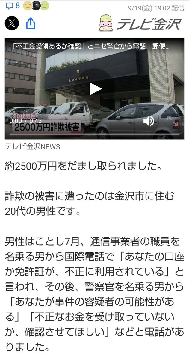 北國新聞の紙面で読みましたが、この詐欺事件はおかしいと直感しました。 石川県警察が全部公表しているとは思えないので、決めつけることはできませんが、私が疑問に感じたところを話します。 北國新聞では金融機関から詐欺の不正口座に使われたと警察に届けがあったことが最初の発端でありました。 pic.x.com/xxYwMSTBUL