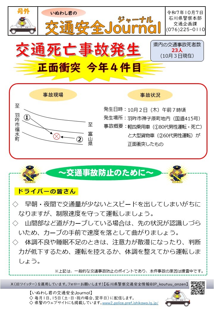 【交通安全情報】 10月7日付け「いぬわし君の交通安全Journal」を掲載します。 バックナンバーは、石川県警察ウェブサイト(www2.police.pref.ishikawa.lg.jp/trafficsafety/…)に掲載していますので、こちらもご覧ください。 #石川県警察 #交通安全 pic.x.com/DlQxLYBdEc