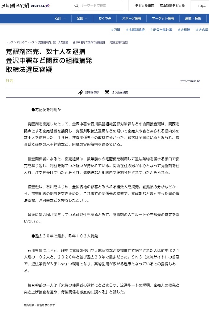 返信先:@GGGG45172217石川県では覚醒剤の摘発に力を入れているらしく。金沢にじのまの元事務局が逮捕された2024年は102人も摘発しているんです。 警察頑張って😣 (画像は2025年2月のニュースです) hokkoku.co.jp/articles/-/166… pic.x.com/hhweoaLfQN
