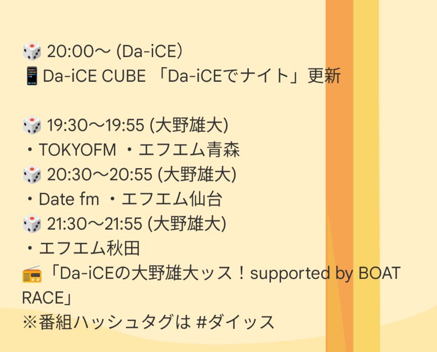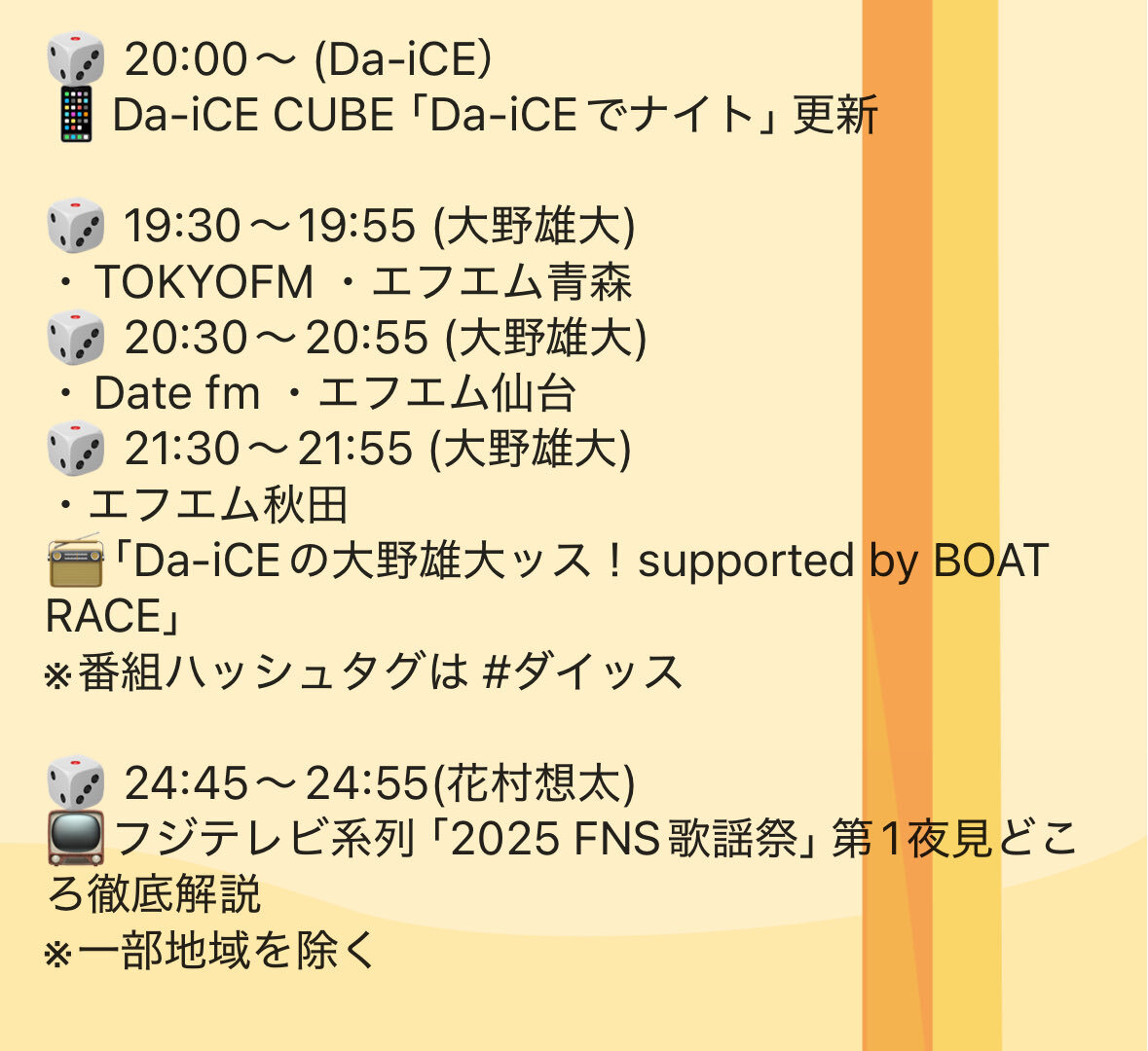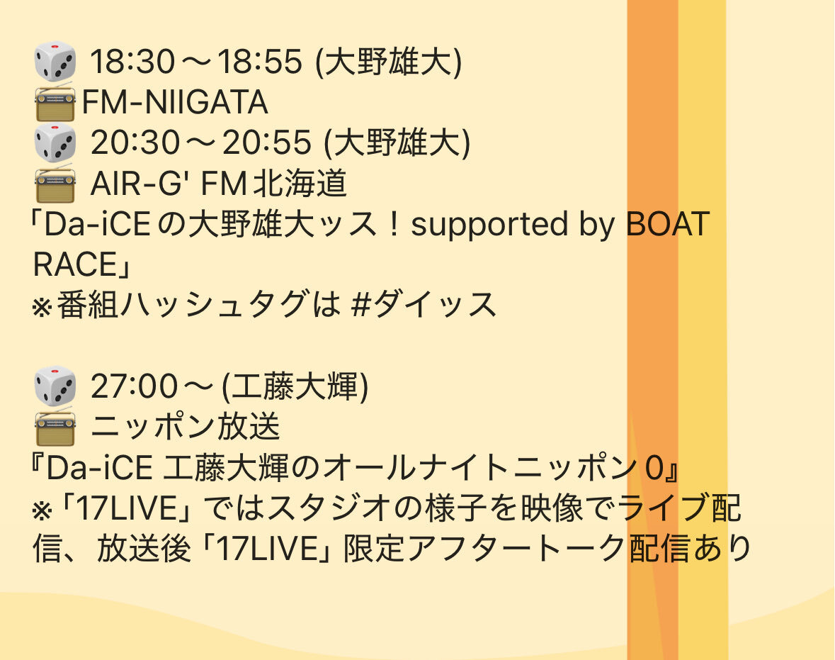 【11/22(土) #Da_iCE スケジュール】 📍久々の大輝くんラジオっ! 📻27:00〜 「Da-iCE #工藤大輝 のオールナイトニッポン0」 ※「17LIVE」でスタジオライブ配信、放送後限定アフトク配信あり ※メールも募集中📩 x.com/ann_since1967/… #岩岡徹 #大野雄大 #花村想太 #和田颯 #Monster #TERMiNaL pic.x.com/CGinAhgbUP x.com/ann_since1967/…