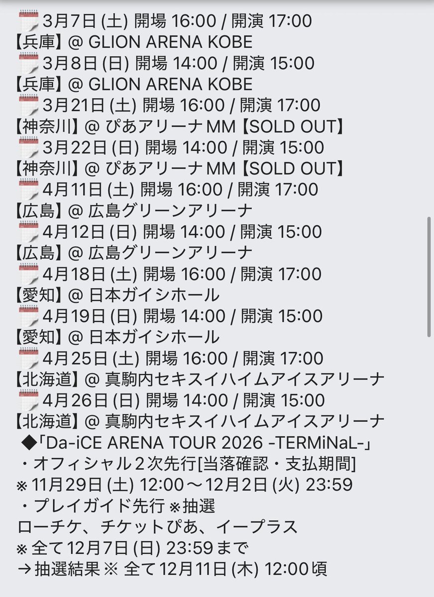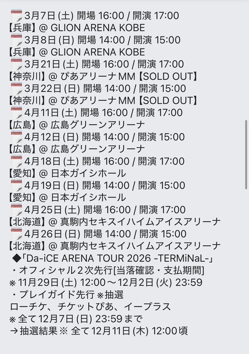 【チケット情報】 「Da-iCE ARENA TOUR 2026 -TERMiNaL-」 da-ice.jp/news/detail.ph… 大変ご好評につき、 下記4公演は予定枚数をSOLD OUT! 1/24(土)・1/25(日)福岡公演 3/21(土)・3/22(日)神奈川公演 本日よりオフィシャル2次先行受付開始! ▼お申し込みはこちら r.y-tickets.jp/daice2601_hp2 ※mu-mo