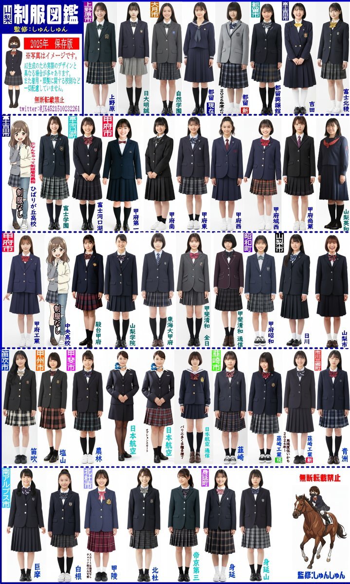 今回は番外編ということで、山梨のJK制服図鑑! 公立・私立を合わせても40校で比較的少ない! AI生成なので再現度が低い学校あると思うけど、多めに見ろし。 大きなミスや抜けがあれば指摘ください。感想や雑談も遠慮なくコメどうぞ! pic.x.com/JeY9btRRGl