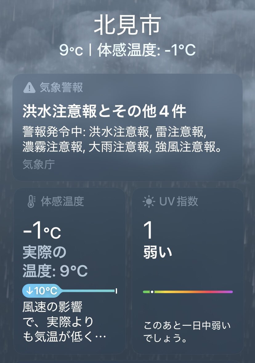 いまの網走。風速17m/sで 暴風雨。 まさに台風じゃ(>_<) これからまだ荒れるみたいなので、今日は早めに店閉めます。連休初日でこれはきついね。真冬で雪ならホワイトアウト状態でしょ。 pic.x.com/X428aUmyHQ