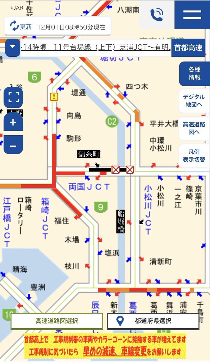 首都高7号小松川線下りは、錦糸町→小松川JCT間が通行止め 接触事故みたい pic.x.com/hlDKsfDSKf
