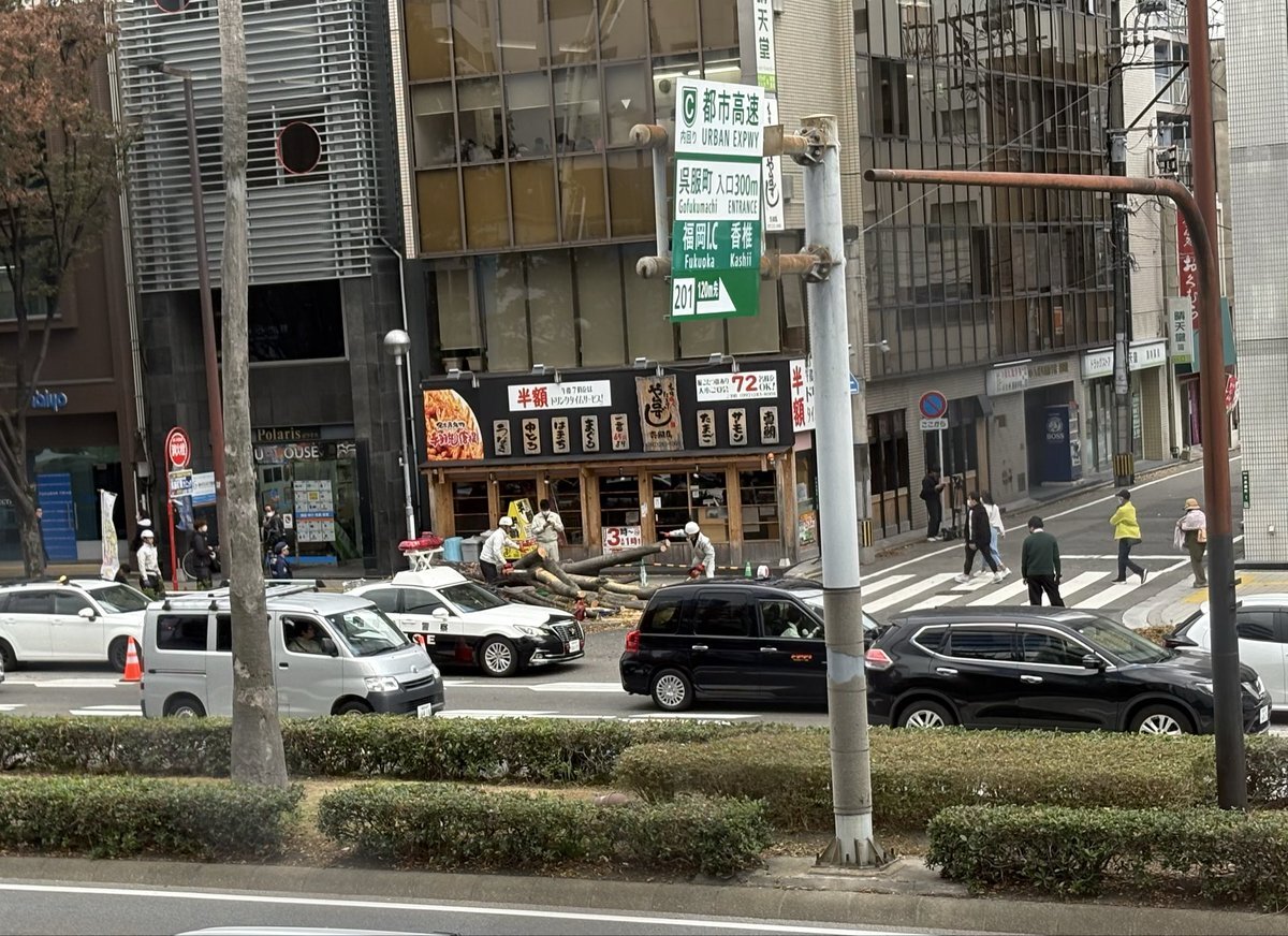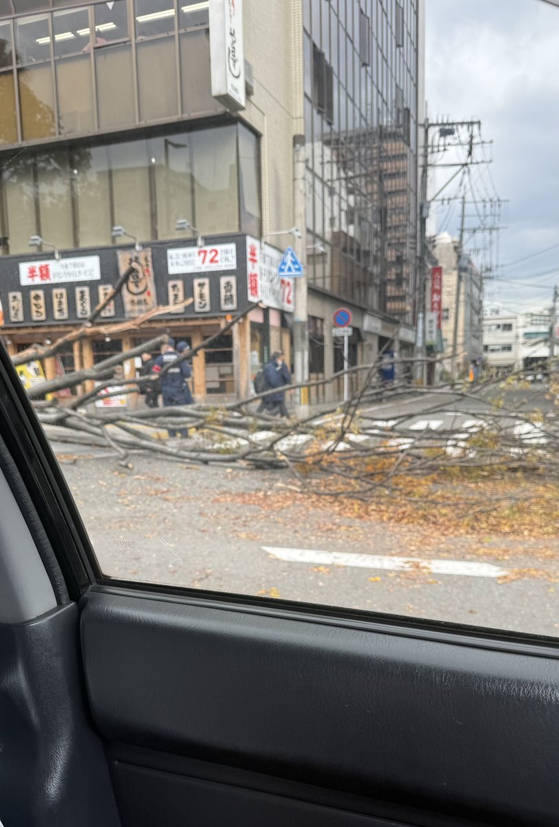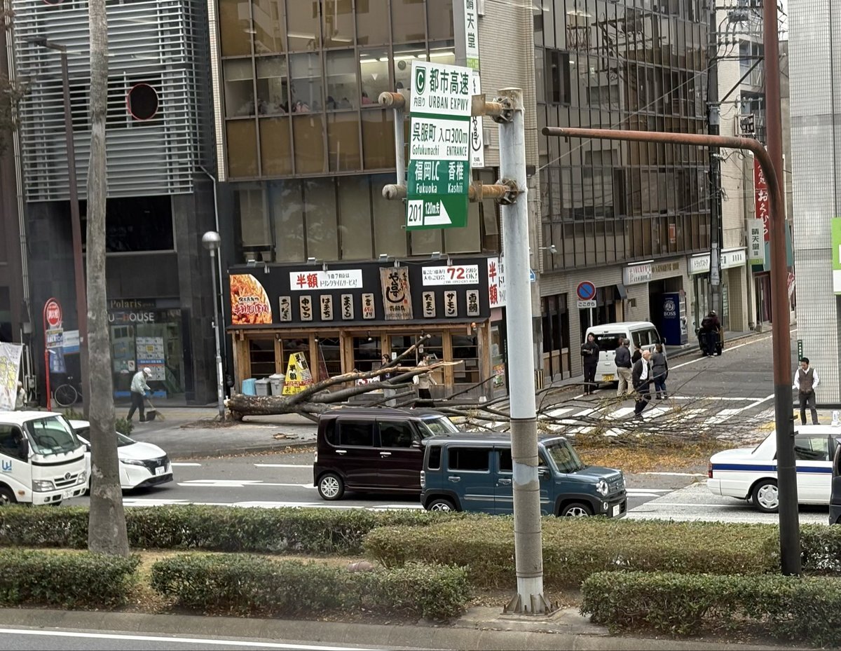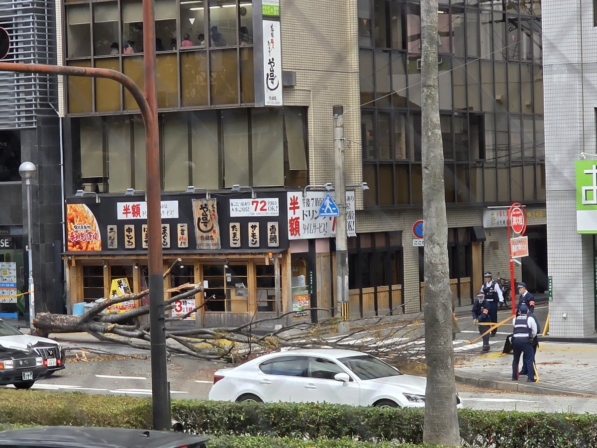 博多で仕事してたら、 メリメリメリッ、ガサーッと音がして木が倒れました。 大博通りの往来の多い通りですが、人も車も無事なようで良かったです。 道に穴が空いたり、木が倒れたり何が起こるかわからないので、注意が必要ですね。 pic.x.com/rrJoLNbPj5