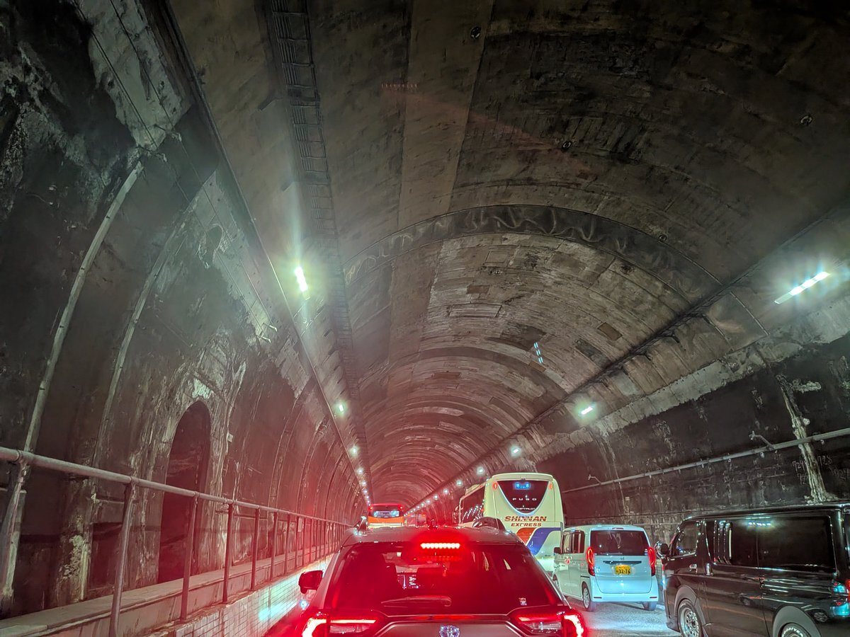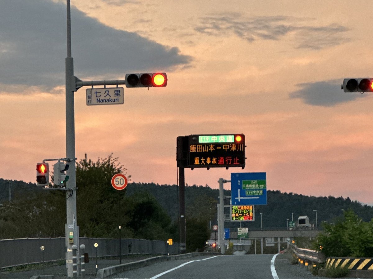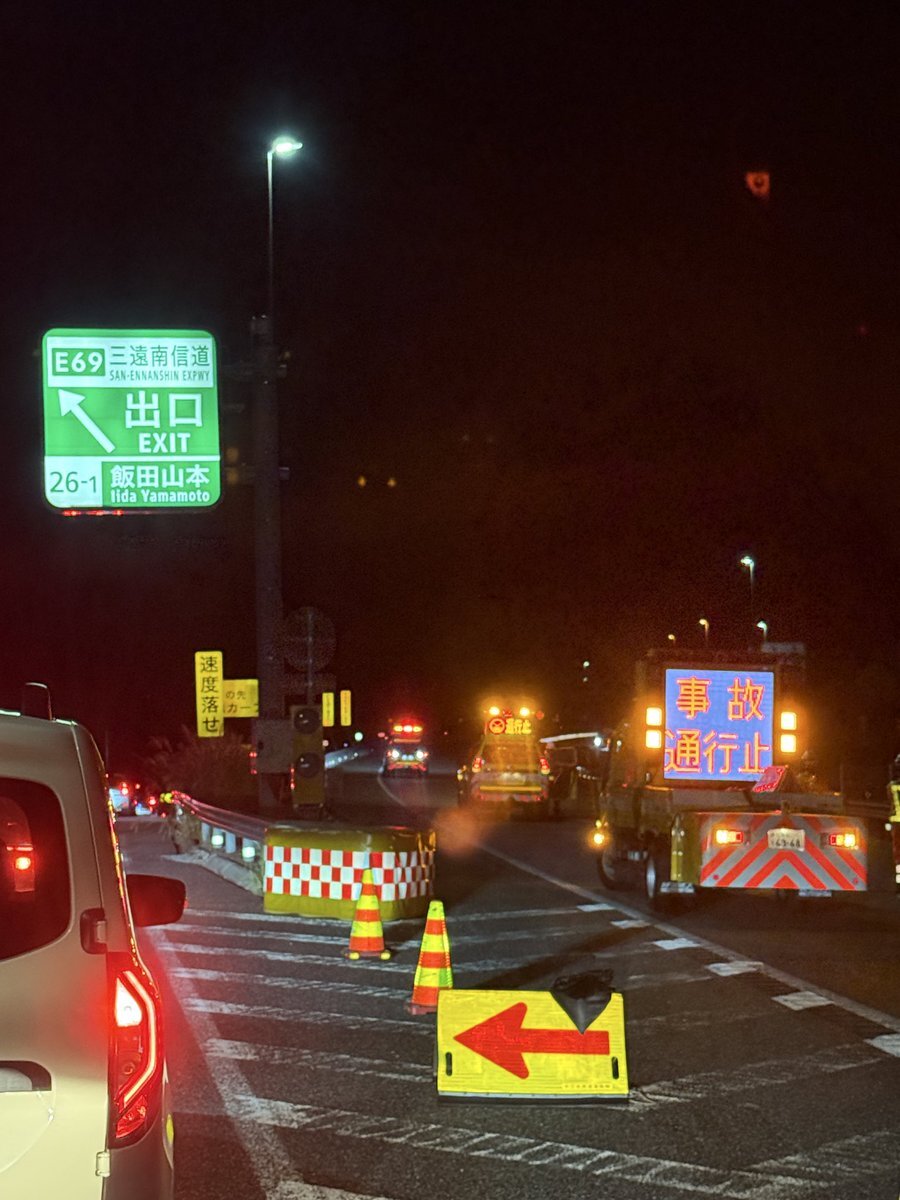 中央道、飯田ICの手前で事故渋滞。前のバスは目的地に着けそうで何より。 私らはどうやって名古屋に行けば良いのか思案中。今日中に帰れるの? で、高速料金取られるの? pic.x.com/BjtV8huhaP