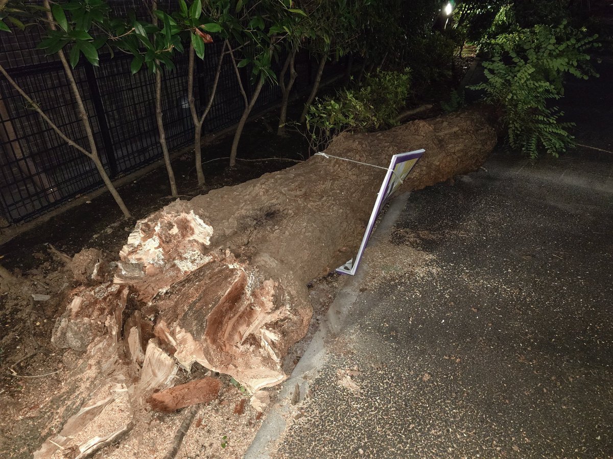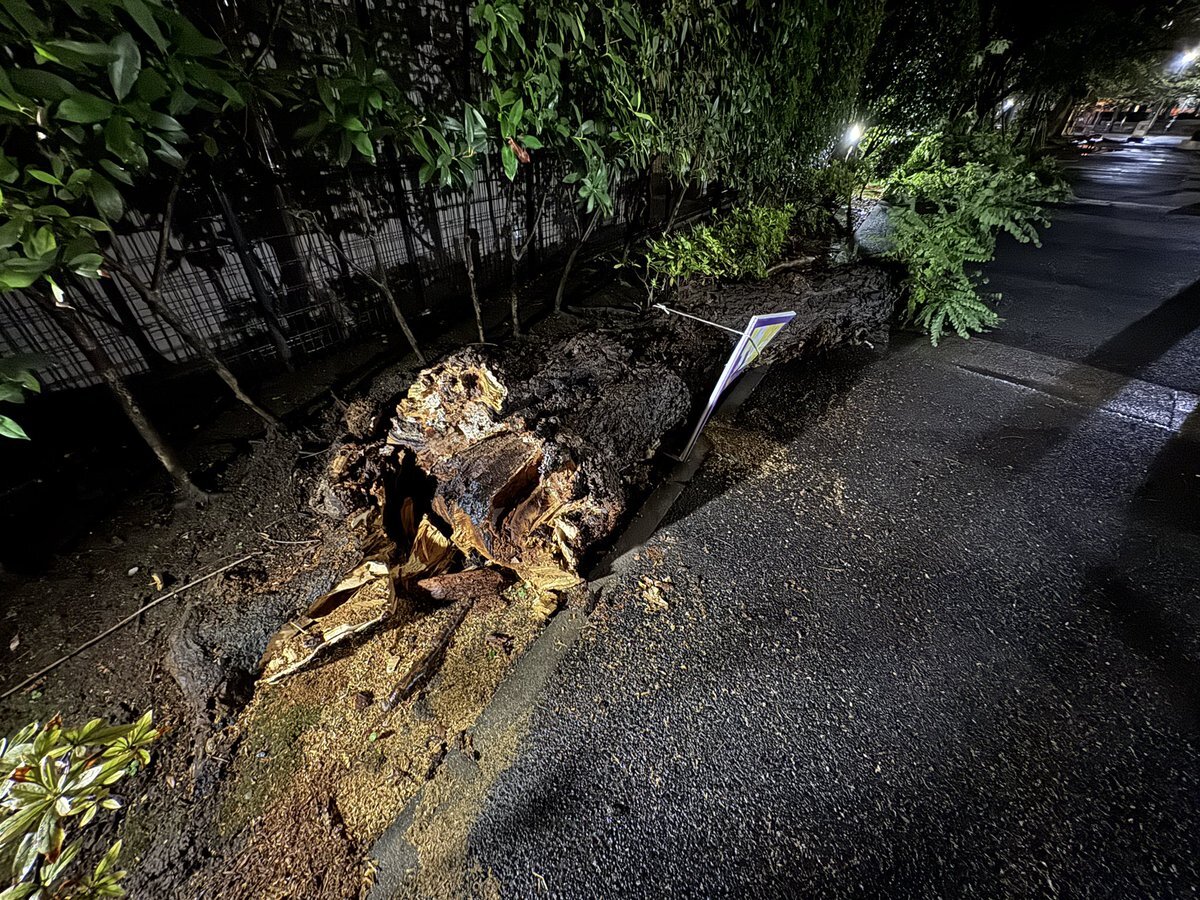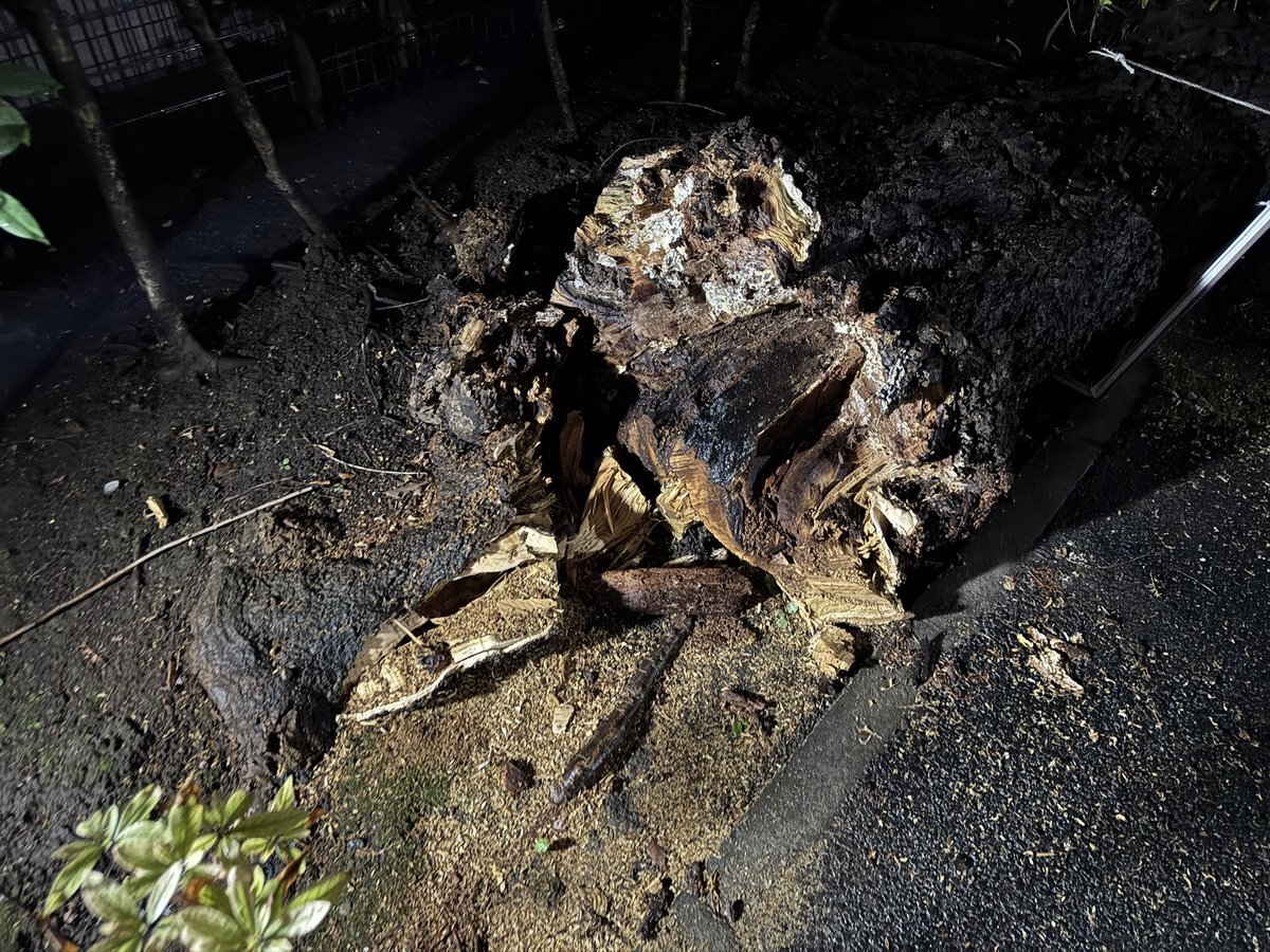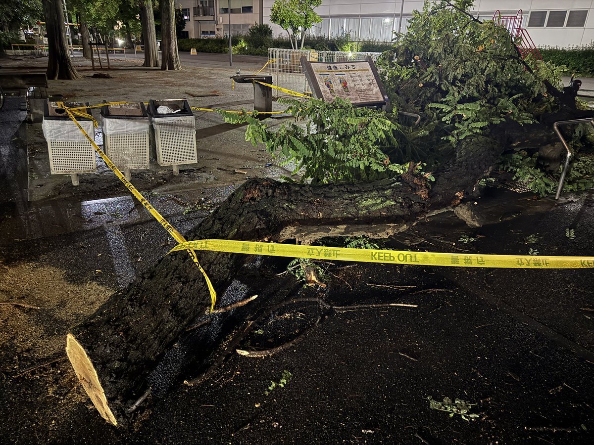 「倒木」 消防団から所用を経て帰宅の家路… 「桜川公園の倒木している」と知合いから連絡あり。。 駆け付けてみれば、胴回り3m、高さ15mはあろう植樹が横たわる。警察の適切な処理が施され滞りなく通行可能。 現段階で状況は不明ですが、一先ず人的被害が無く安堵。 明日周辺調査、近隣植樹確認実施 pic.x.com/dgVkZRDSi5