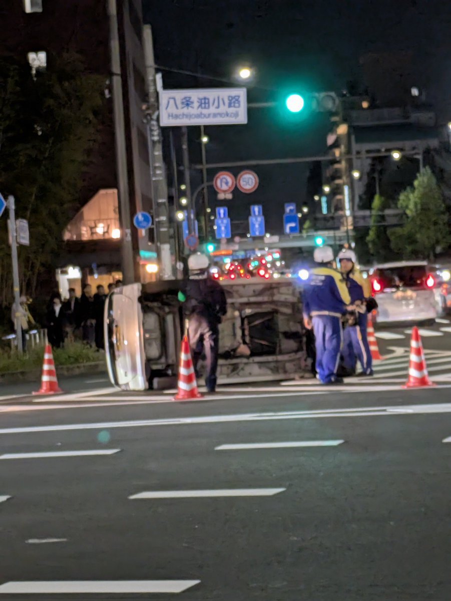 八条油小路交差点。 ワンボックス自動車 こけてはります。 pic.x.com/TjYHXjNNIq