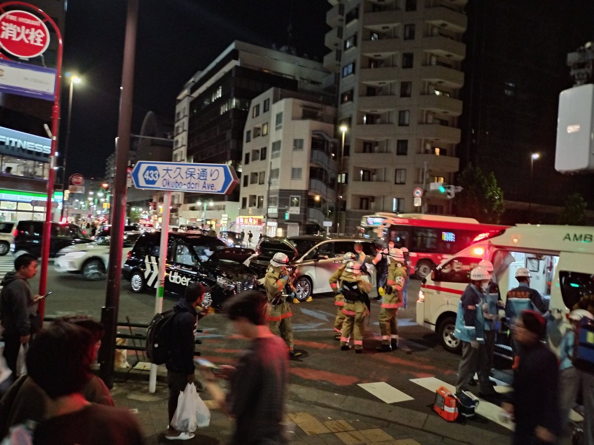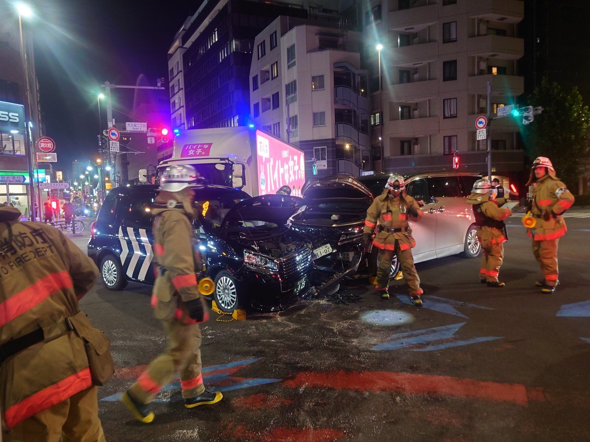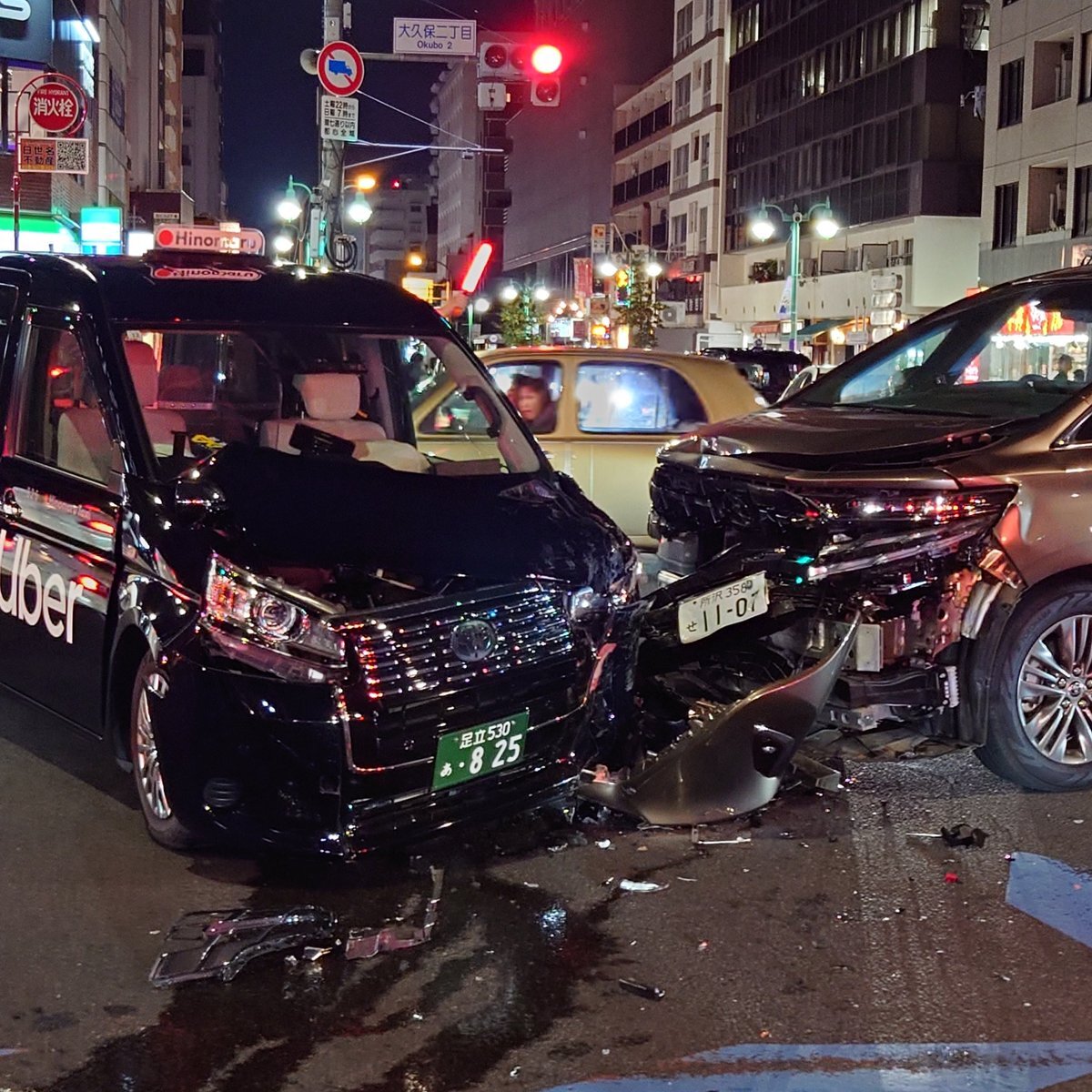 東京新宿区、大久保通りと明治通りの交差点で自家用車とタクシーの衝突事故発生。 両車両、事故状況保存の為交差点で立ち往生。渋滞発生中。警察・救急・消防車両出動。 車両から液体漏れ有。 pic.x.com/MRD0e5i89Z
