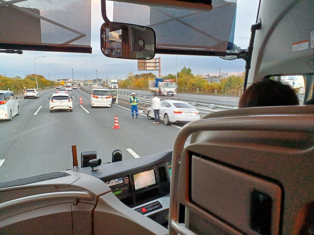 そして運ちゃんが予めアナウンスしてた通り 関越道上り事故渋滞か 遂に止まり始めたな 鶴ヶ島手前だから 現場この辺りか? 休憩三芳じゃなく高坂にしておいて正解だったね