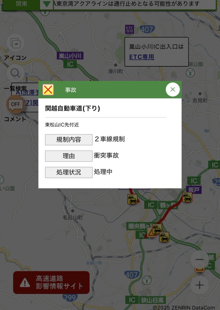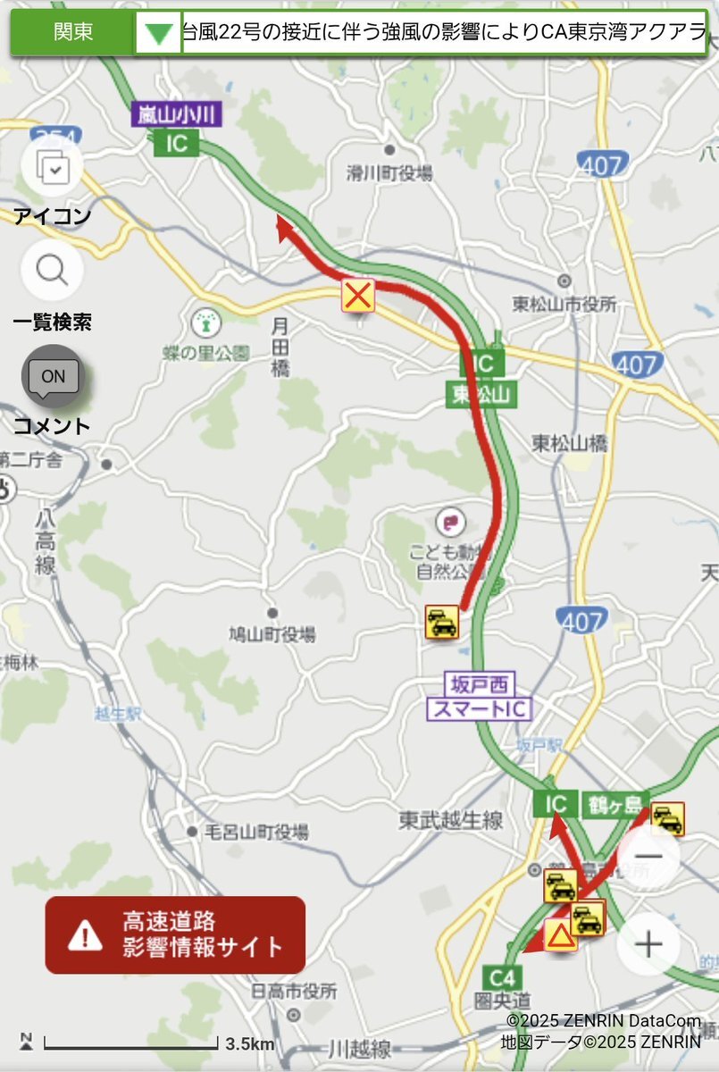 関越道 渋滞 キャンピングカーの横転事故 東松山IC付近