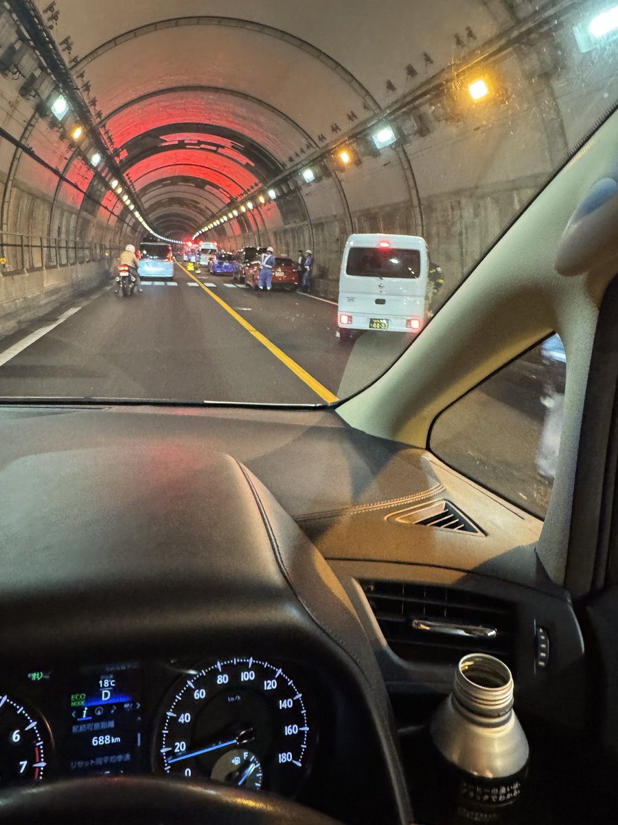 朝っぱらから東名下りで事故渋滞くらってます、、 カマロが悪い意味でHotになってる 調べたら2車線のトンネル内で7台くらいが絡む多重事故😇 日曜はこれが怖いですねー pic.x.com/PUUrr0sJVm