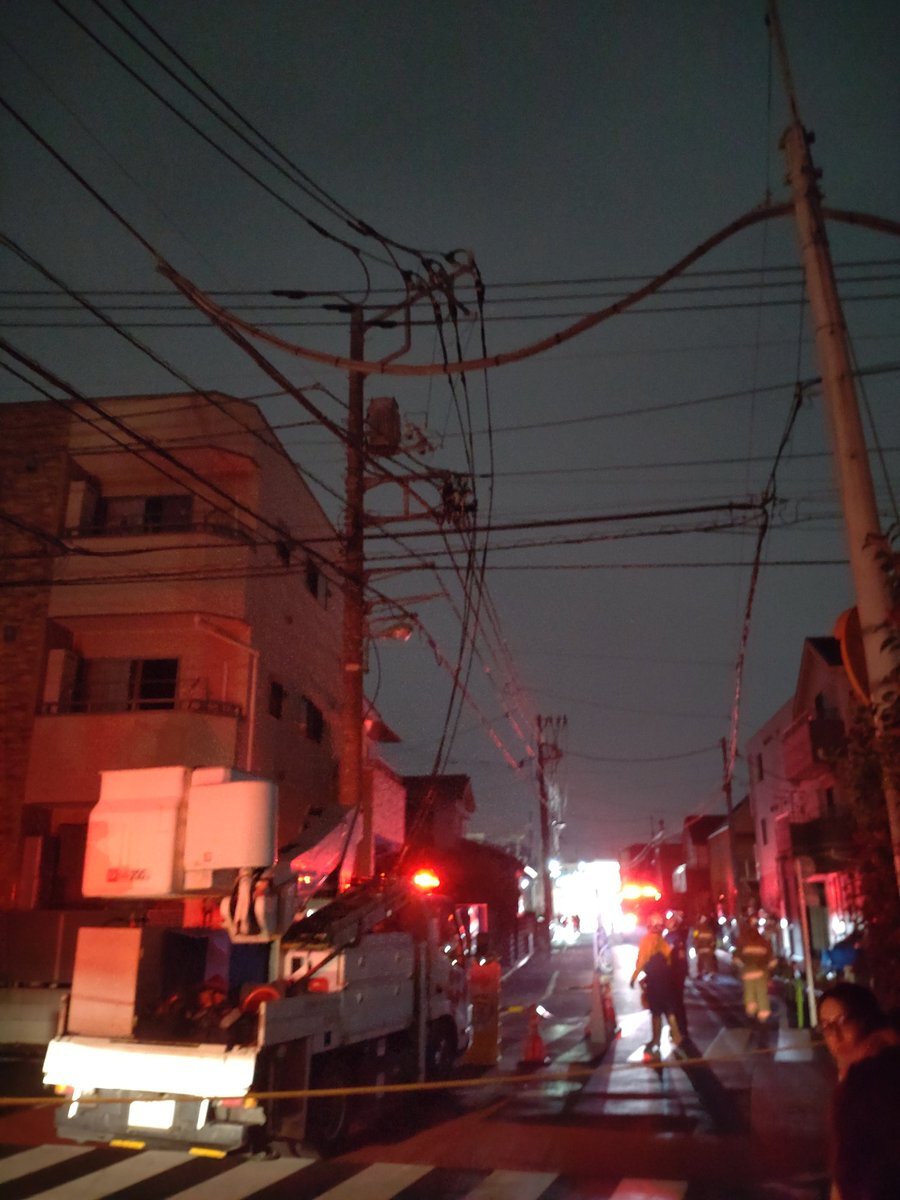 ただいま練馬区、停電中 このあと 高所作業車による作業とのこと。。。 電線切れたとの情報あり。。。 #練馬区 #停電 pic.x.com/RnXZaNymJJ