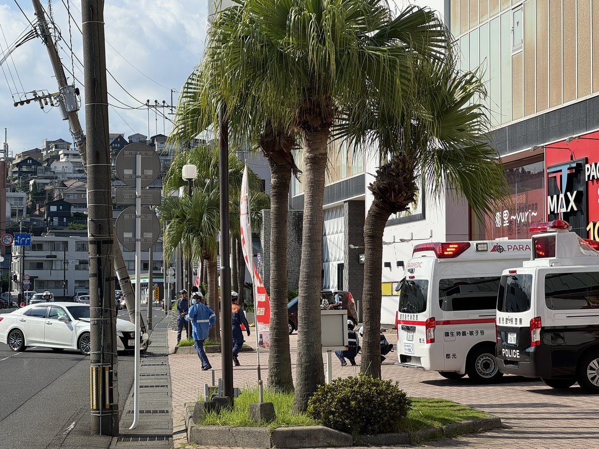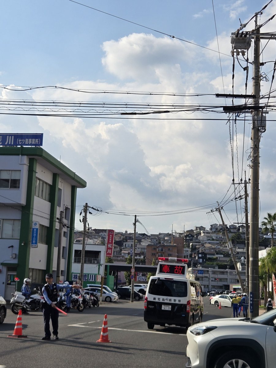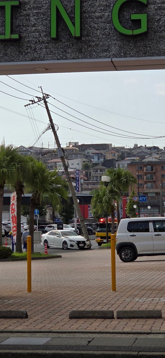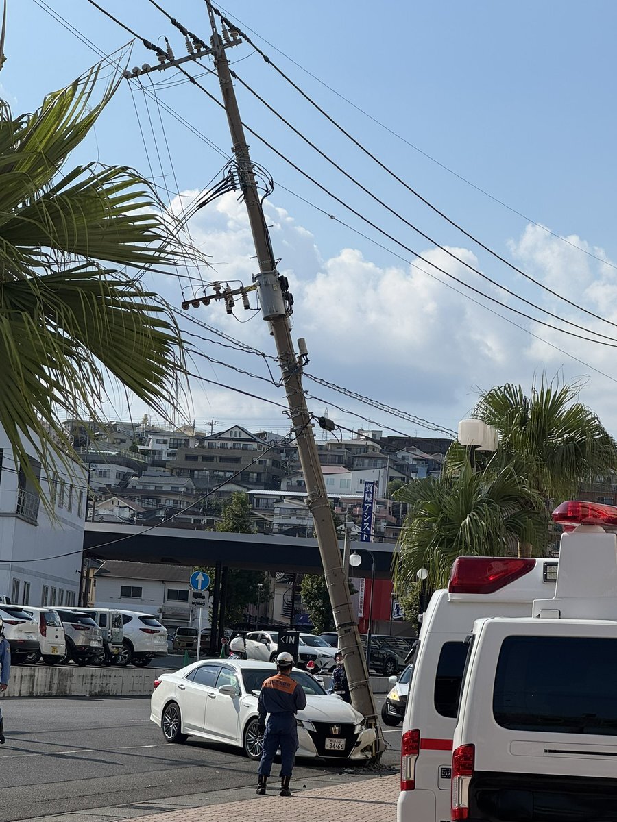 新栄のT-MAXの前の電柱に21クラウンが突っ込んで ぶち折ってる、、、 道路も警察の方たちが塞いでる😵💫😵💫 乗ってた人とか大丈夫やろか。 #鹿児島市 #事故 pic.x.com/NhjfvkBvus