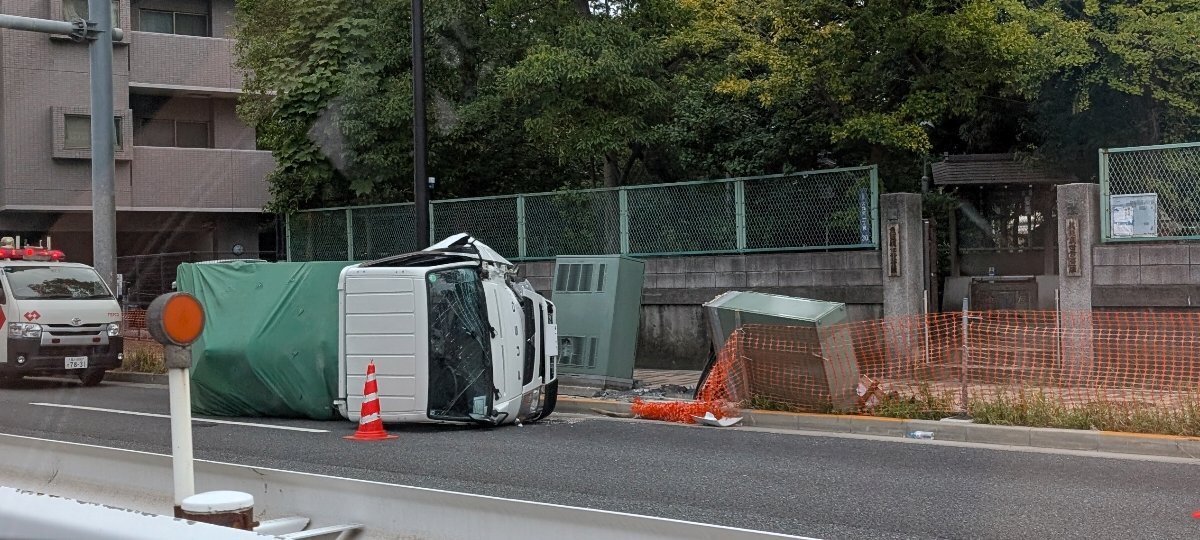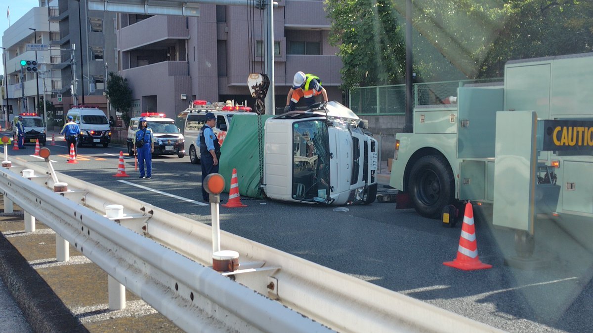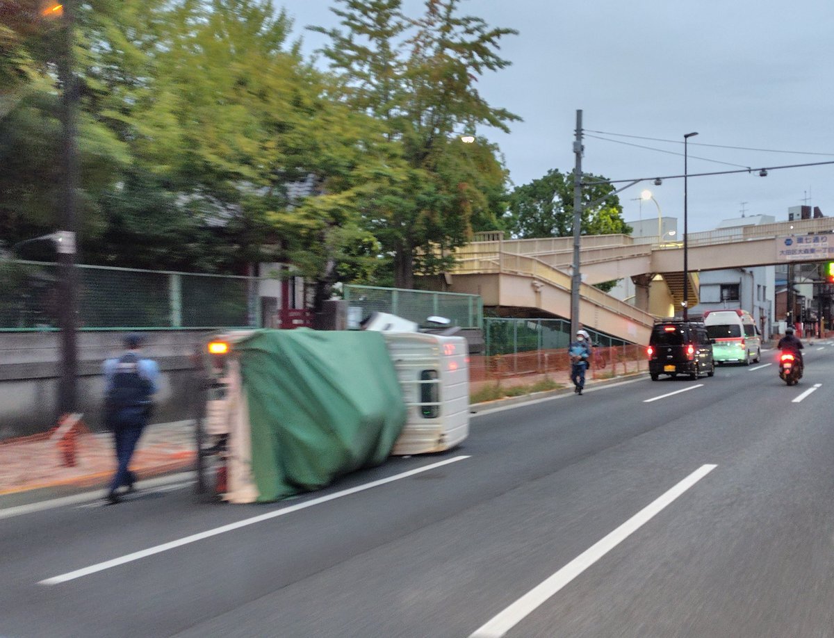 環七 渋滞 トラックの横転事故 大田区 大森消防署前交差点付近