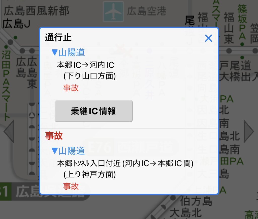 山陽道 渋滞 トラックの事故 積荷が散乱 本郷トンネル付近