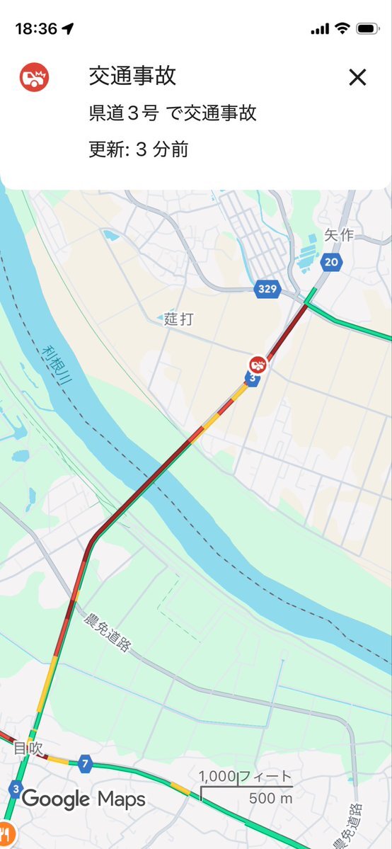 県道3号 渋滞 車の事故 坂東市莚打1614-1付近