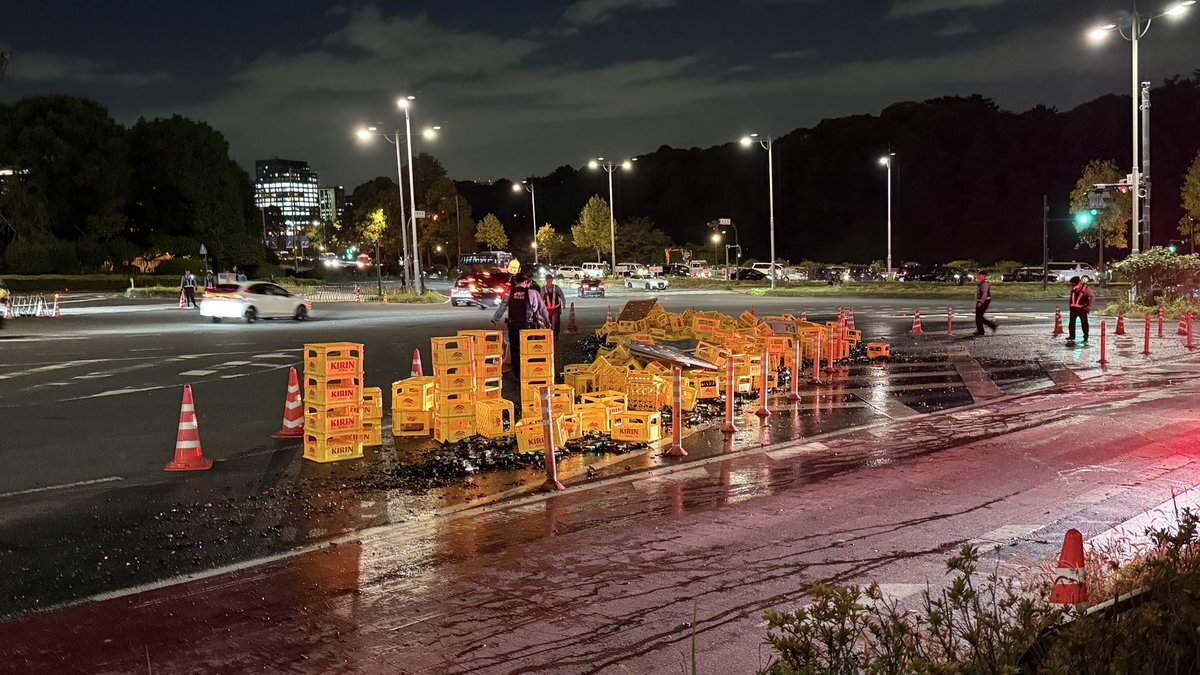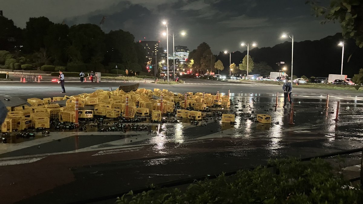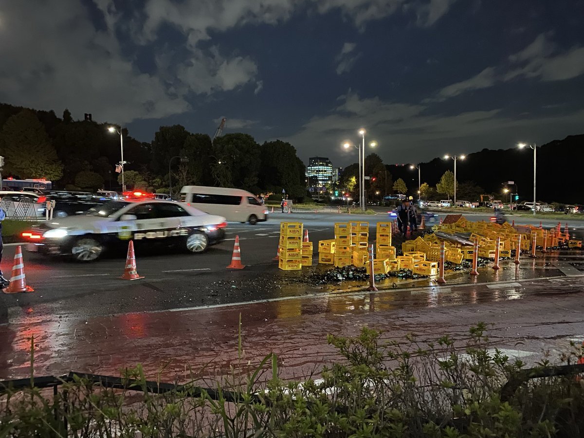 警視庁前の坂のところでトラックが事故ったのか、大量のビール瓶が割れててビール臭やばい🥹 pic.x.com/W3hbL4Nx5I