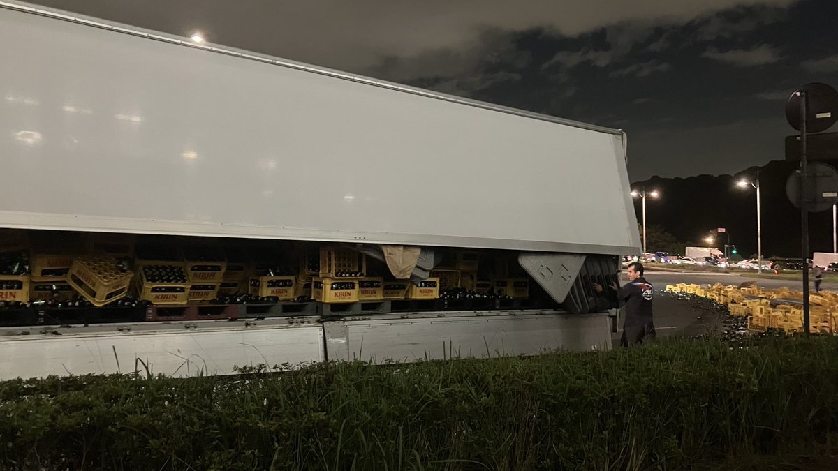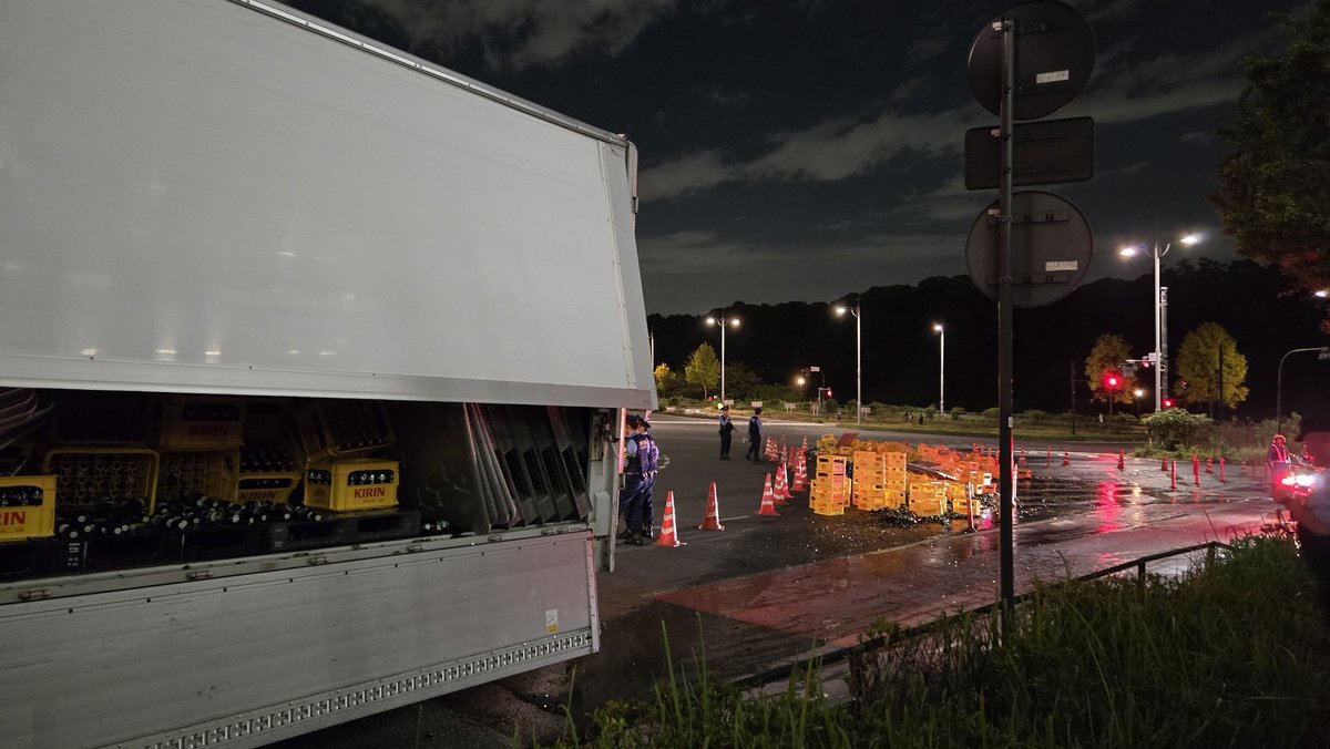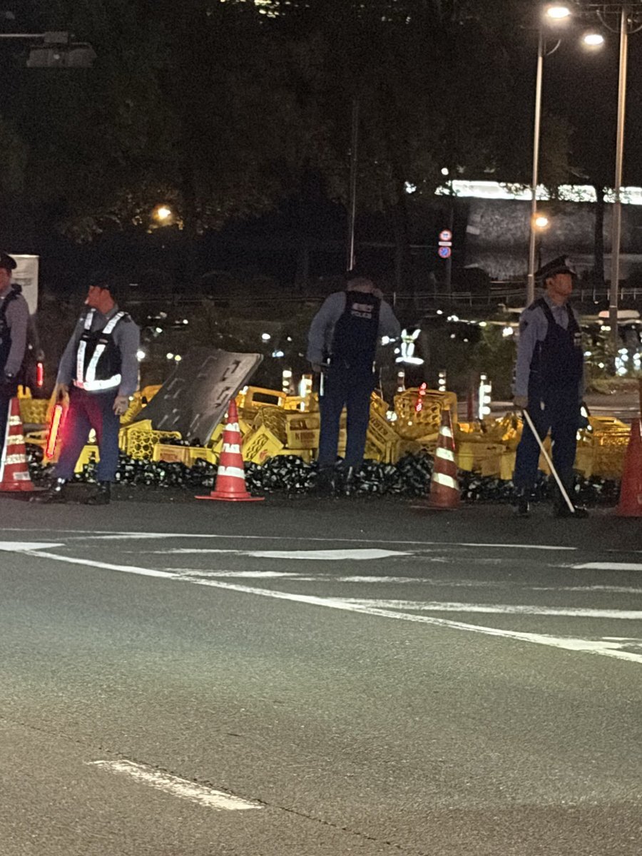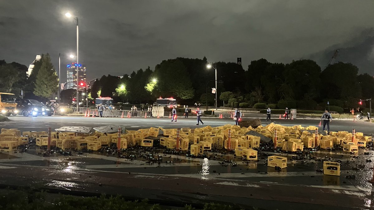 警視庁前の坂のところでトラックが事故ったのか、大量のビール瓶が割れててビール臭やばい🥹 pic.x.com/W3hbL4Nx5I