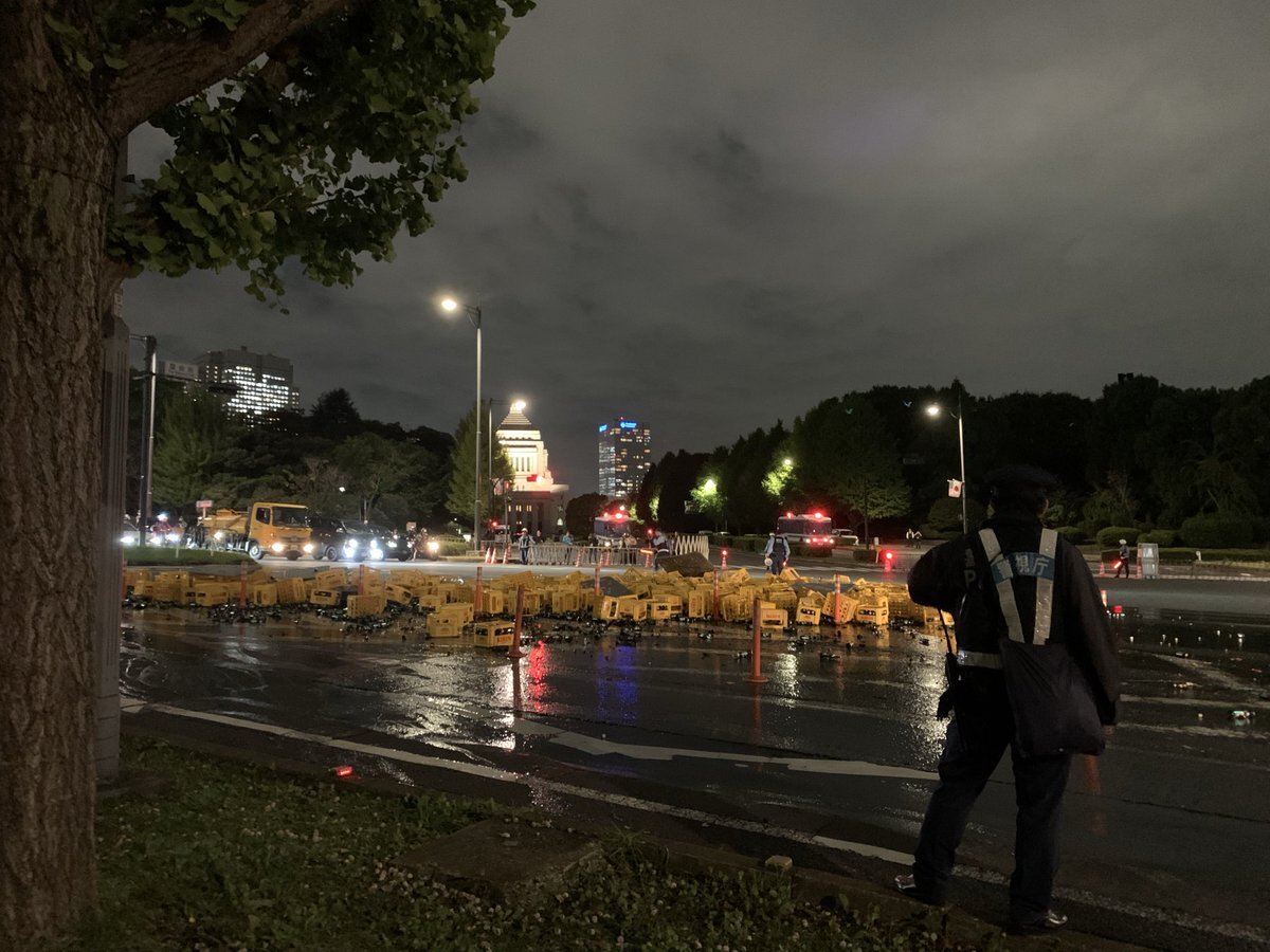 国会の前で酒瓶を積んだトラックが事故ってるんですが めっちゃ臭う pic.x.com/kNVbIg5YhD