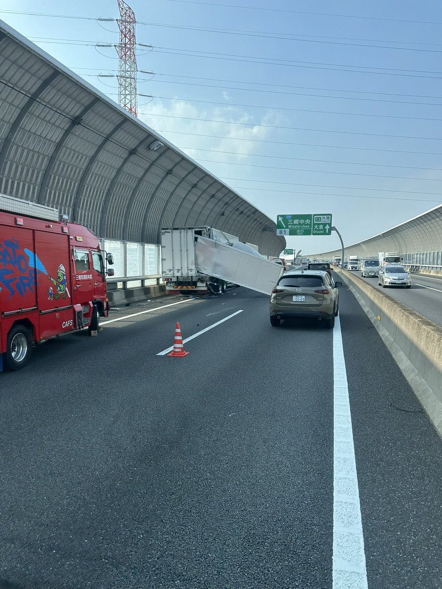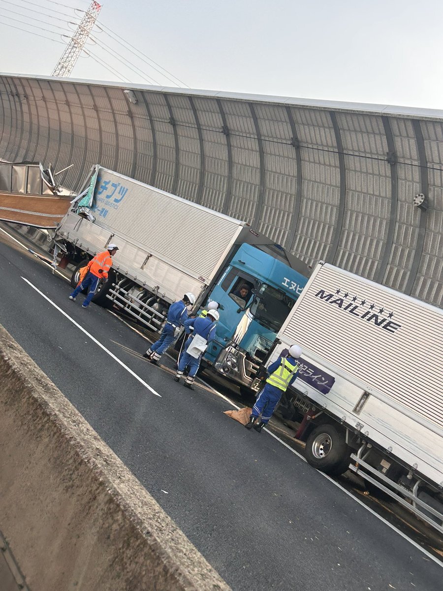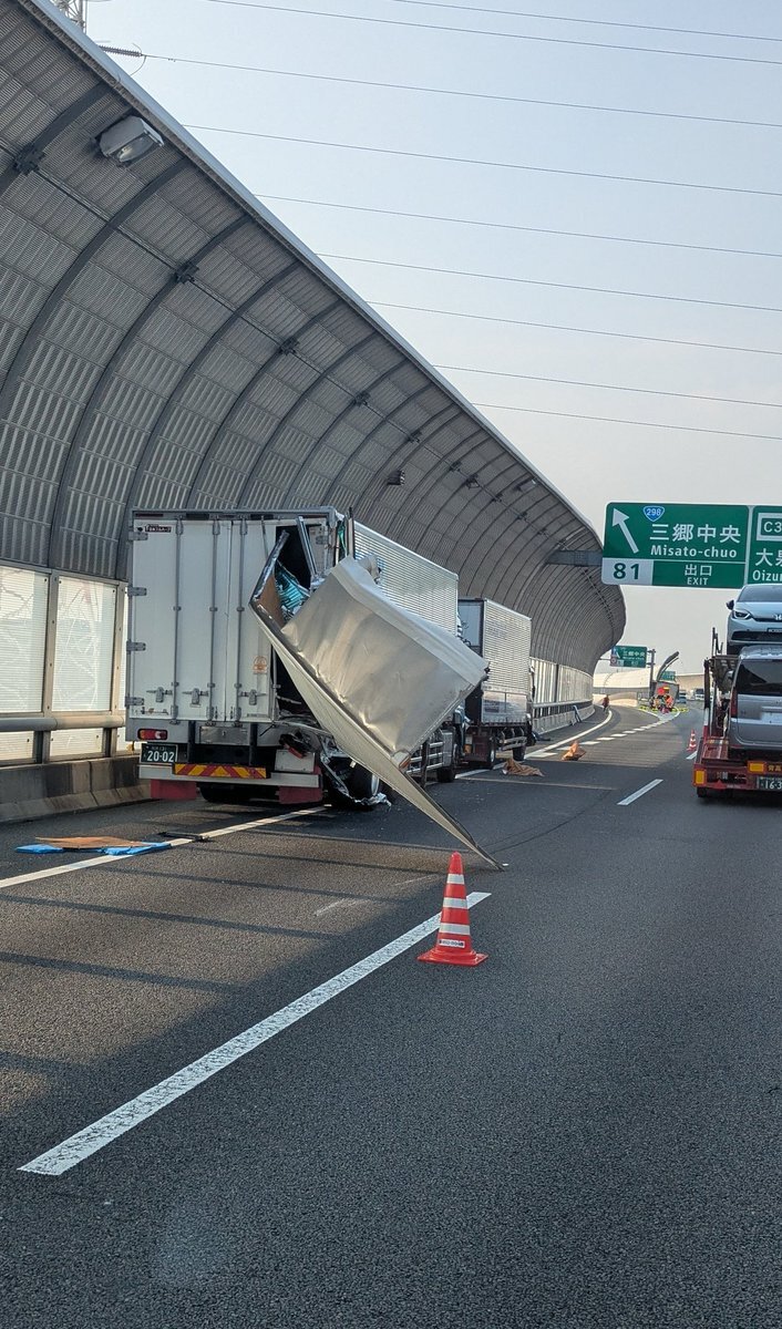 外環道内回り三郷中央付近 トラック3台絡む事故発生🚚 pic.x.com/SKbjAUt1cl