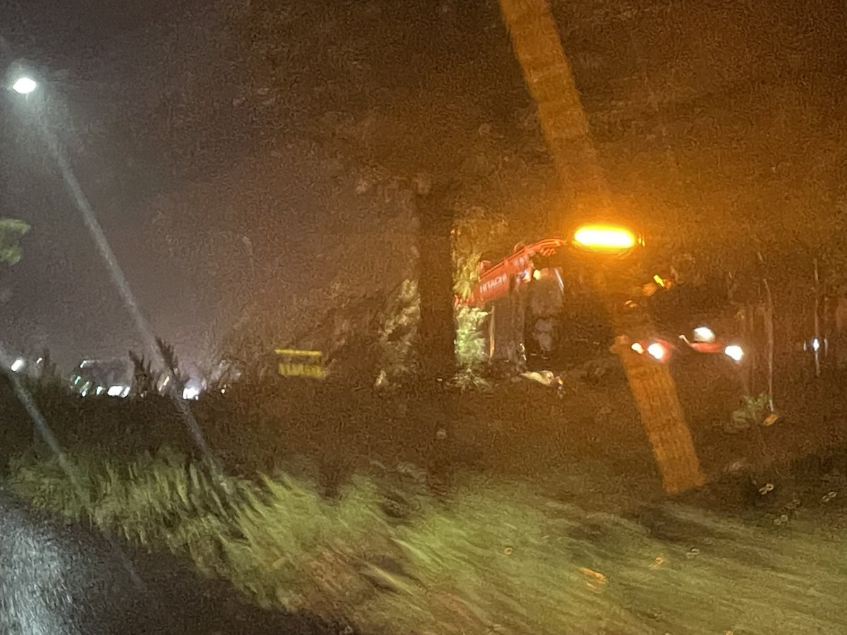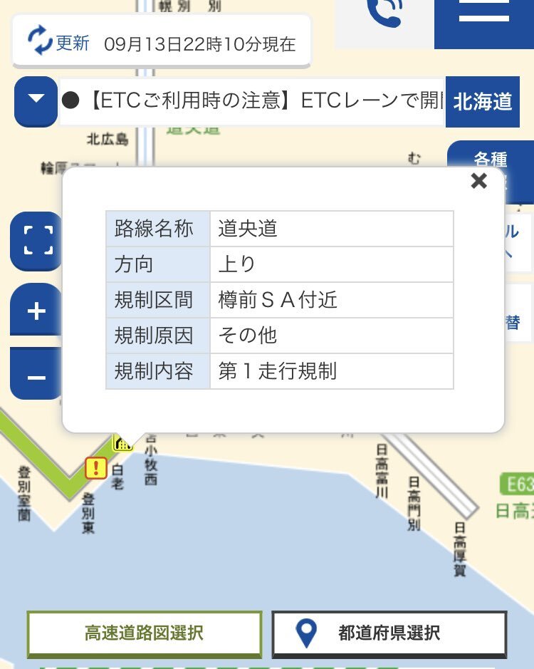 道央道走ってたのだが、主に風と雨がやばく千歳辺りからかなり枝葉が走行車線に散乱する状況 風速15m/sのなか苫小牧から室蘭まで走りましたが、22:10現在 樽前SA〜白老IC間で斜面が崩落して第一通行帯規制中(※規制車到着済み) 走行の方はご注意を⚠️ pic.x.com/CQ74tVRQSu