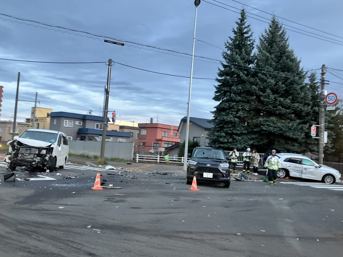 西野屯田通と新川通が交差するところで事故です。 周辺消防、救急車、警察で渋滞しています。 車はめちゃくちゃ、1台歩道乗り上げ、大きな事故です。 通る方はお気をつけください。 pic.x.com/1yfyH4gnK0