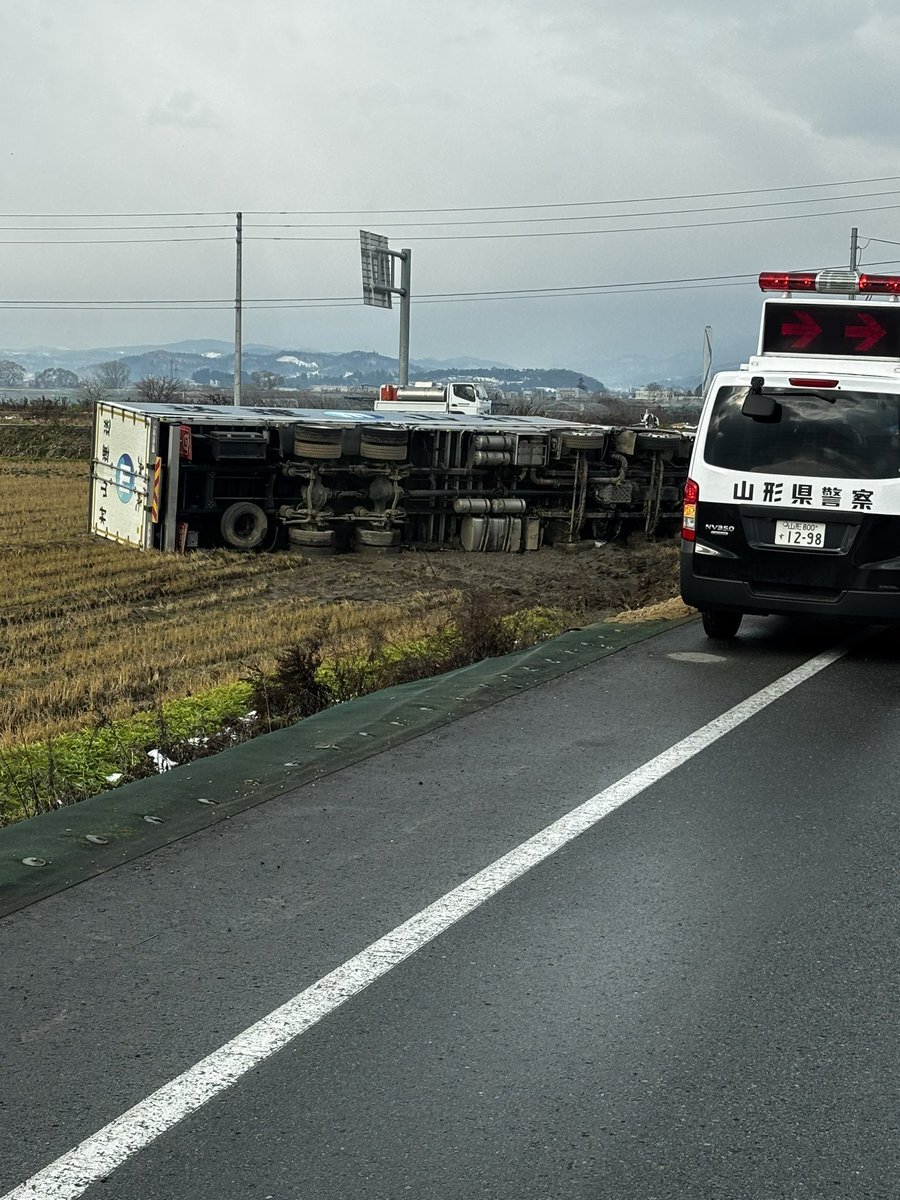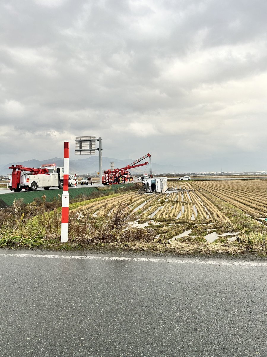 寒河江の方に用事があったから、ゆぴあの近く通ったけど、大型トラックまだ田んぼの中に突っ込んだままだった。 ここ結構通行量多い道だけど帰宅ラッシュまでに上げれるのかしら。 会社の近くだから同じ会社のトラック何台も通ってたのシュールだった。 田んぼは大丈夫かしら? pic.x.com/J8YQp7vidU x.com/takachanman148…