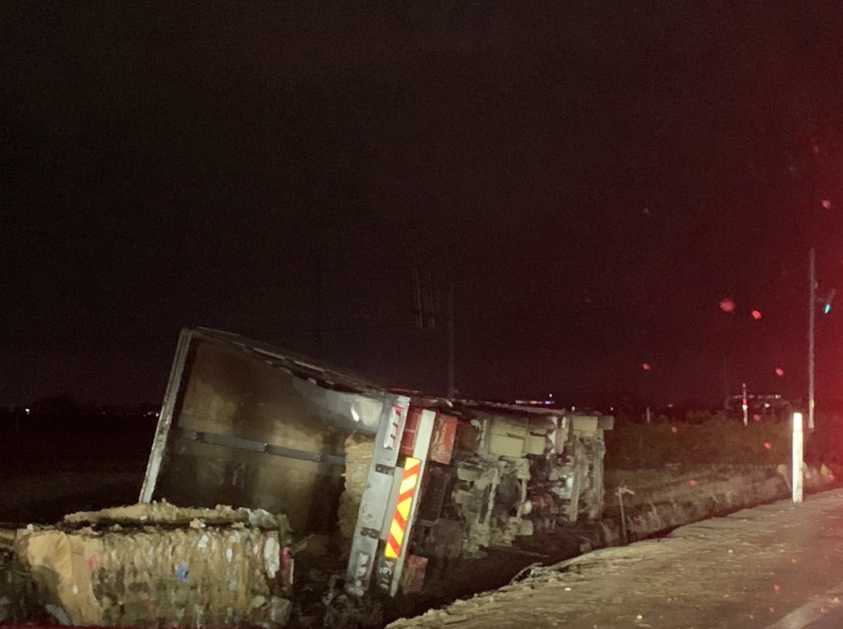 県道23号 トラックの横転事故 天童市蔵増4916-1付近