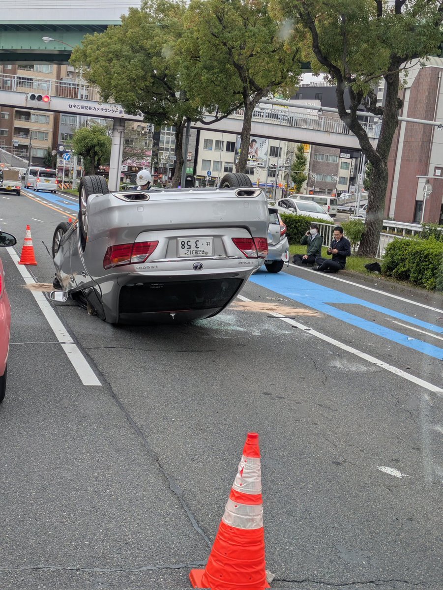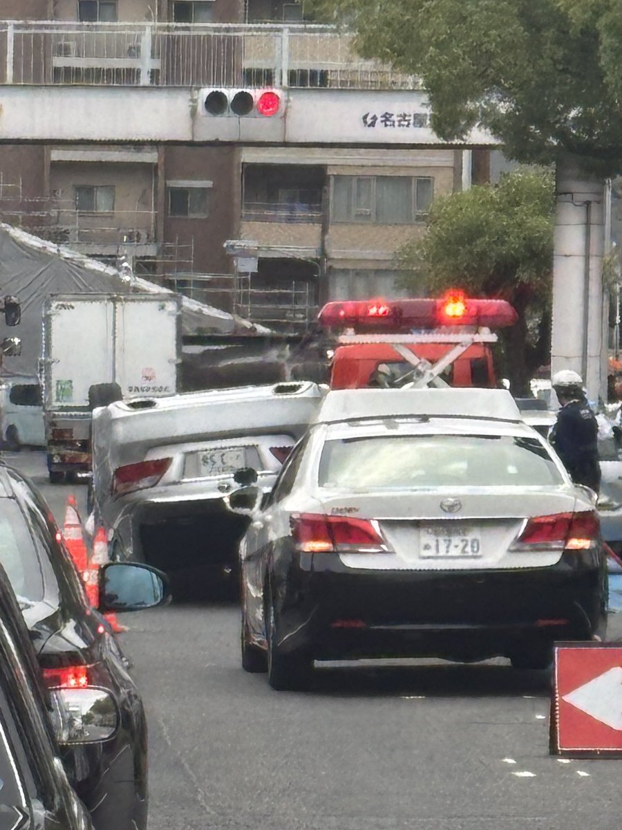 渋滞 車の横転事故 名古屋市中区 鶴舞交差点付近