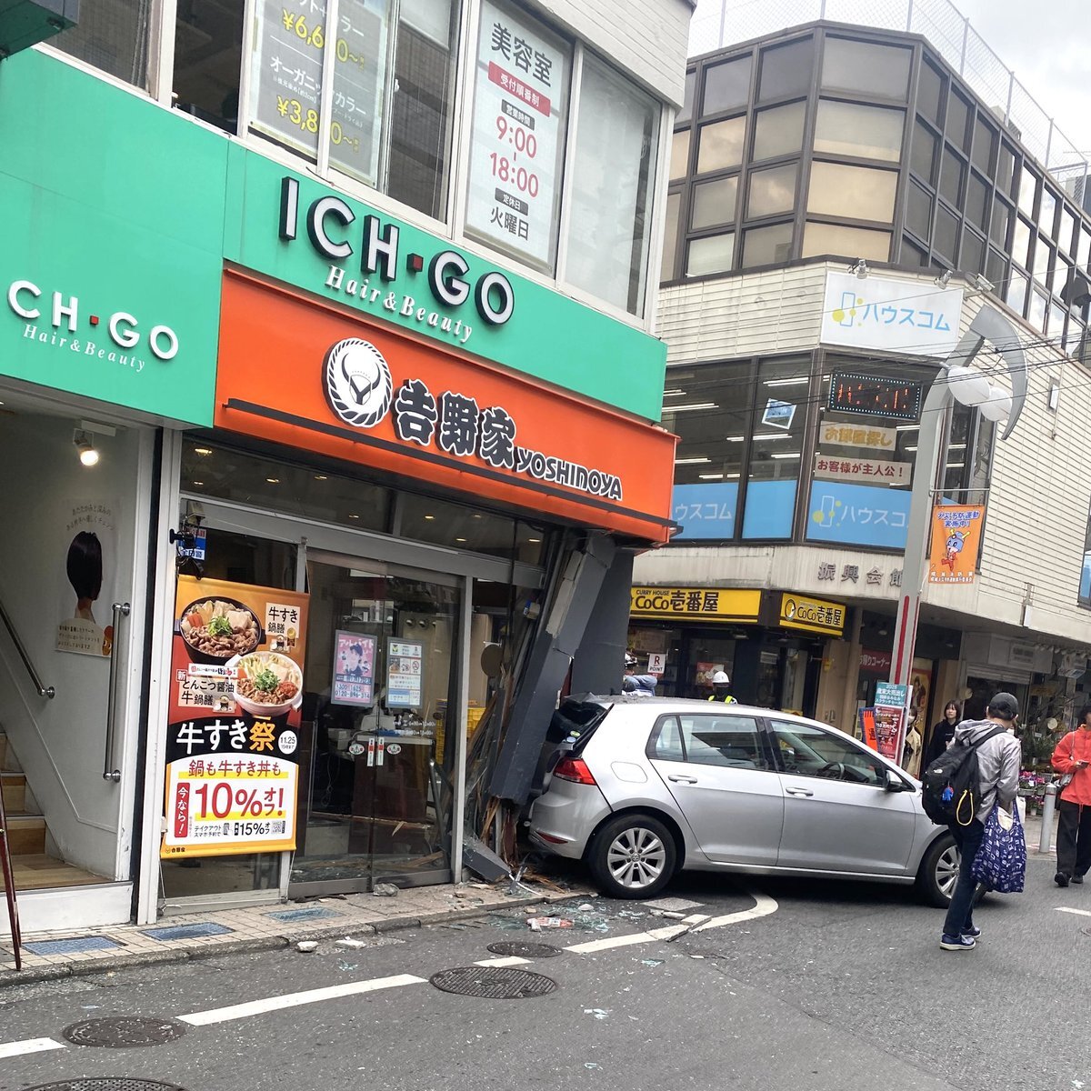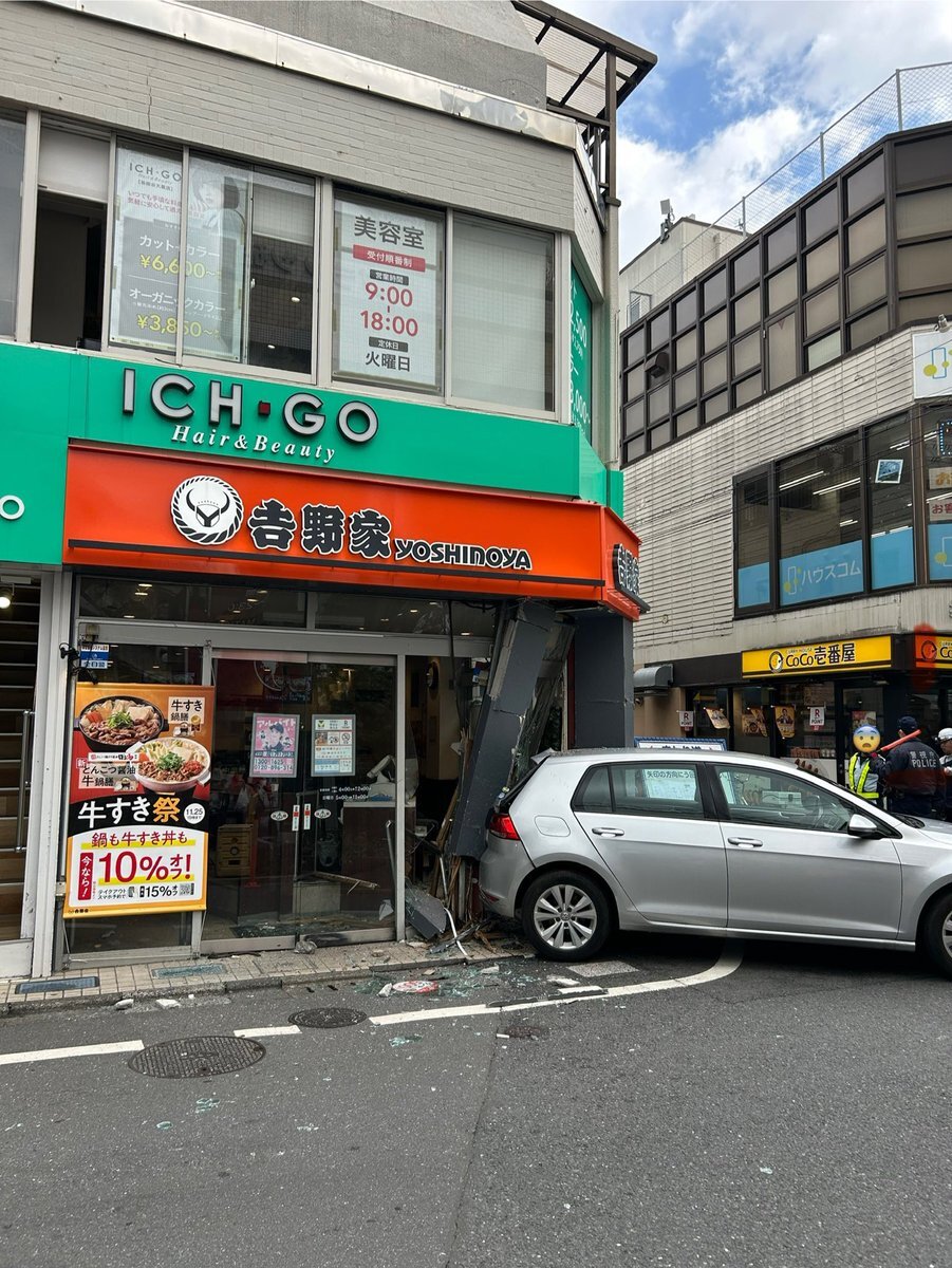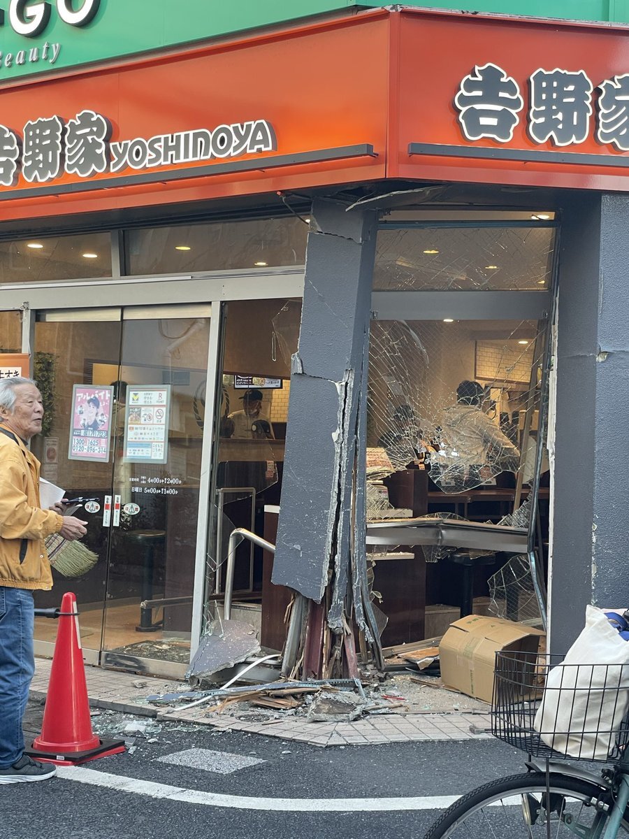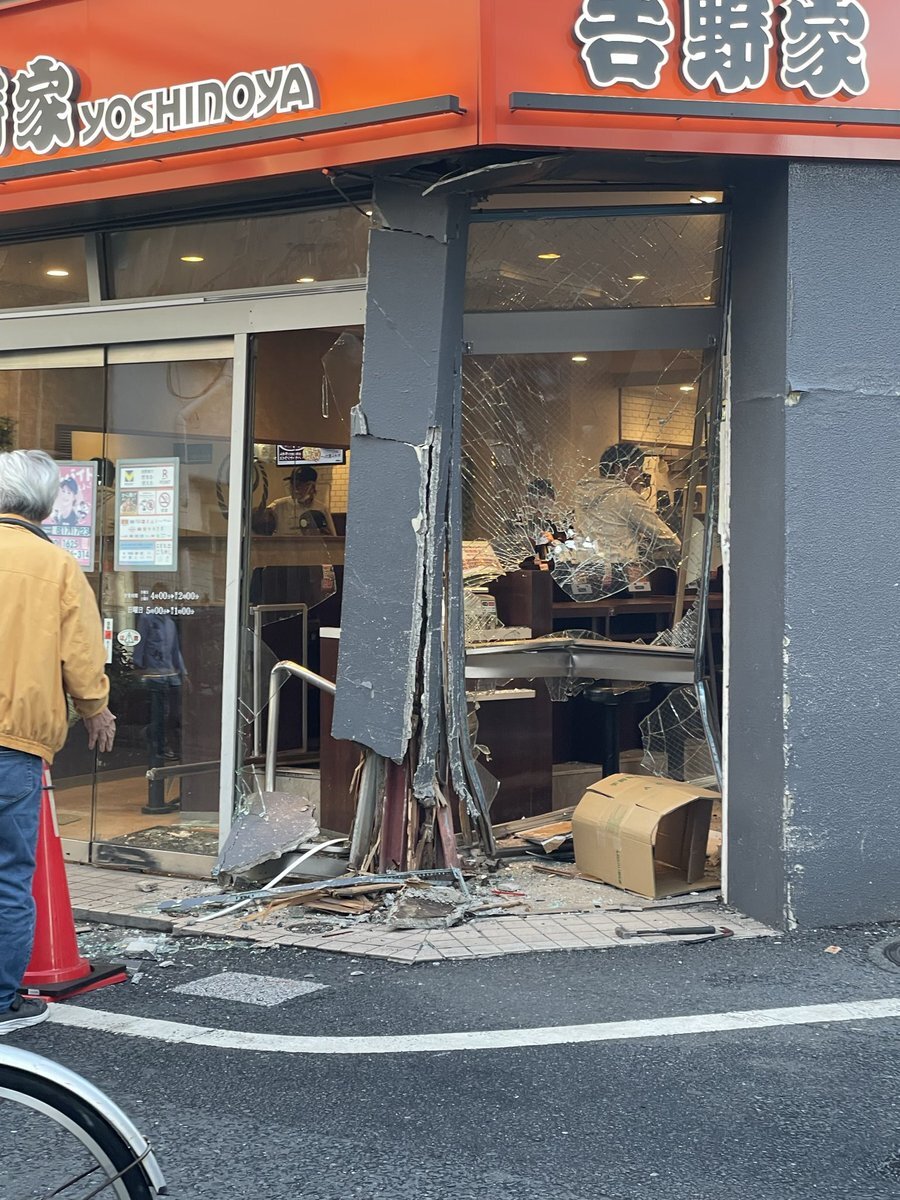 店舗に車が突っ込む事故 世田谷区砧6丁目39-6 吉野家 祖師ケ谷大蔵駅前店 ※撮影は日中