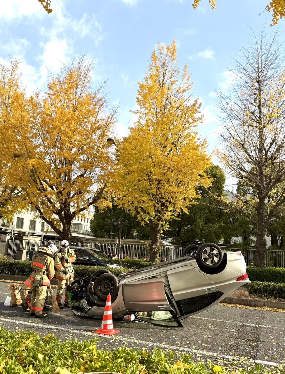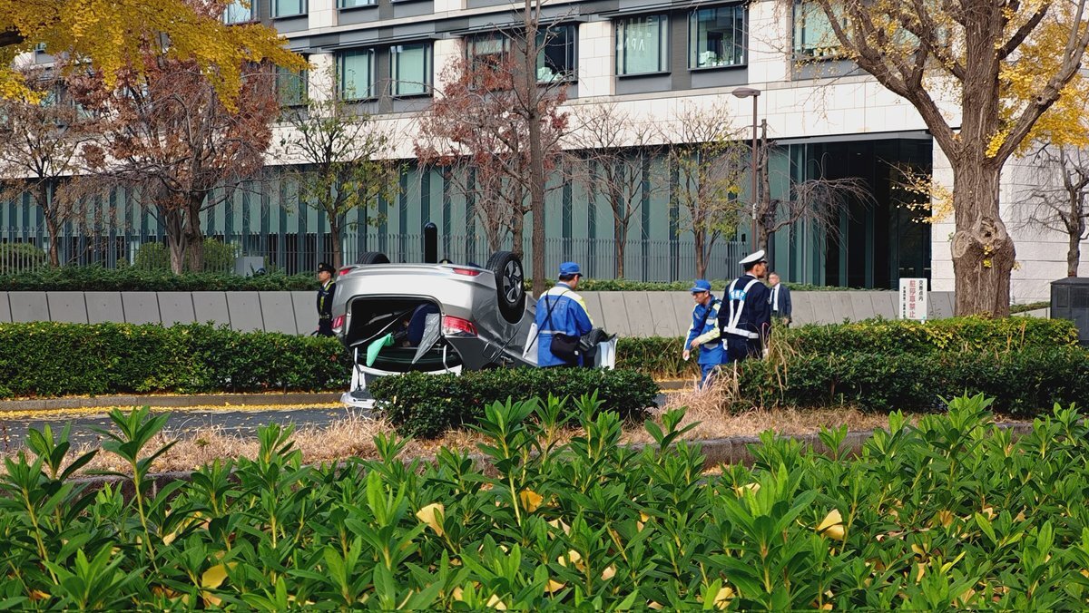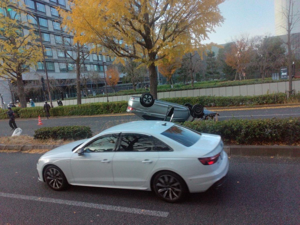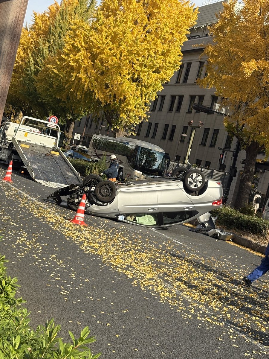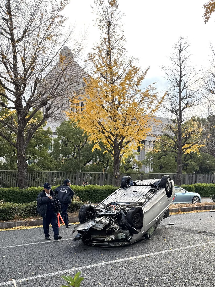 衆議院議員会館と参議院議員会館の前で事故。 パトカーに消防車まで出動していて何があったんだろうと思ったら初心者マークのついた車が逆さになっていました。 事故にあった方が無事でありますように pic.x.com/I9iFYbQWhm