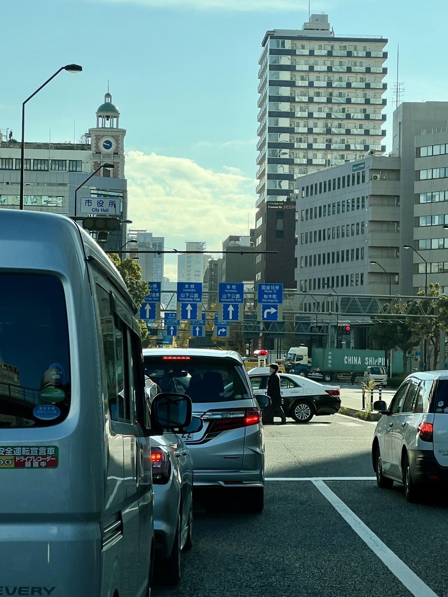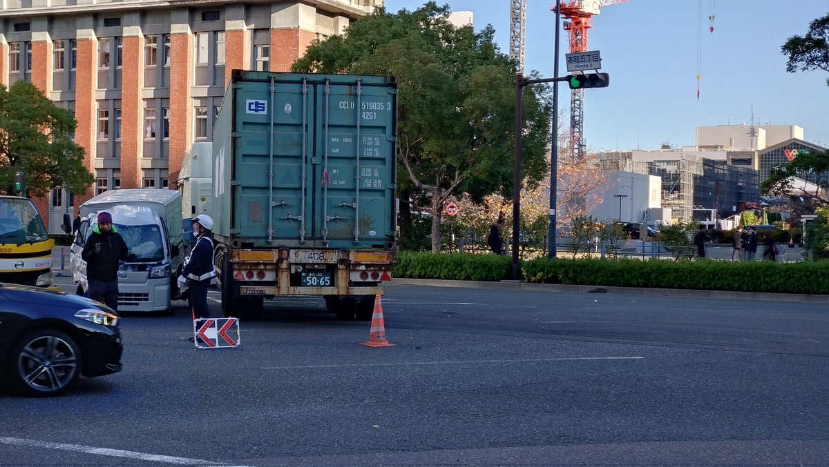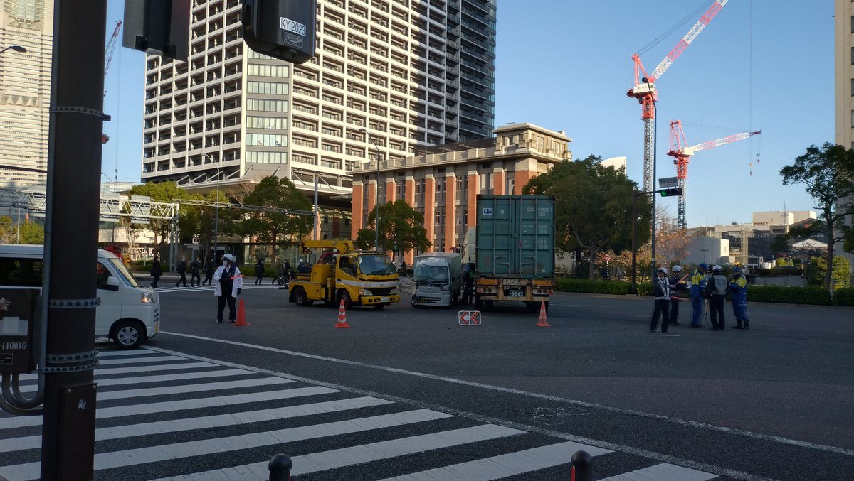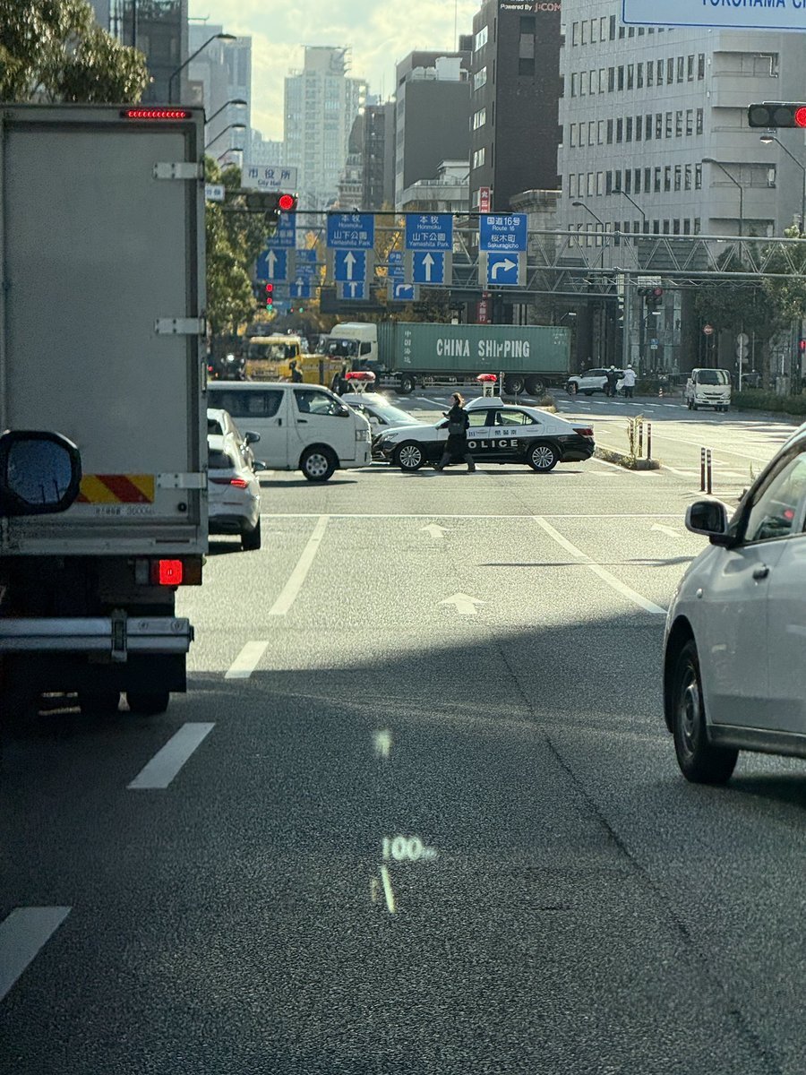 #横浜市役所 前道路事故で規制中 ランドマークタワーから市役所へ向かうと、市役所前道路をパトカーでふさぎ、二人の警官が赤棒を持って左右に誘導しています。右側レーンに入り誘導に従ってください。山下町方面、桜木町駅方面からは市役所前には出れない感じです。お気をつけて! pic.x.com/X6EkBlNTS4