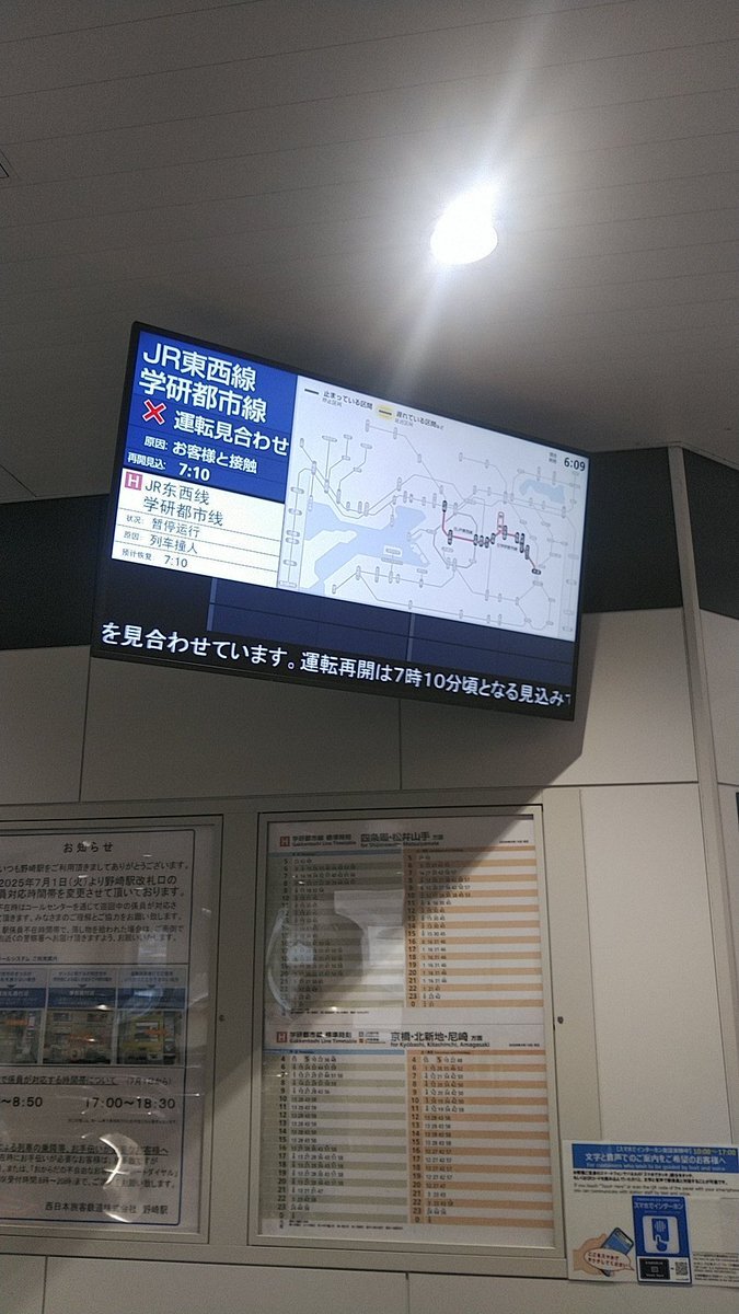 10月7日6時26分現在: 6時05分頃、学研都市線:住道駅で列車がお客様と接触したため、尼崎駅〜木津駅間で運転を見合わせています。このため、振替輸送を実施しています。運転再開は7時10分頃となる見込みです。 #JR西日本 #学研都市線 #JR東西線 trafficinfo.westjr.co.jp/kinki.html pic.x.com/jjKUBlUk7y
